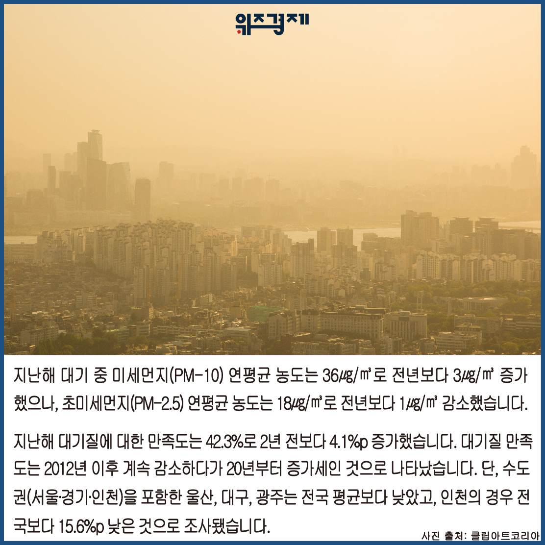 지난해 대기질에 대한 만족도는 42.3%로 2년 전보다 4.1% 증가했습니다. 대기질 만족도는 2012년 이후 계속 감소하다가 20년부터 증가세인 것으로 나타났습니다. 단, 수도권(서울∙경기∙인천)을 포함한 울산, 대구, 광주는 전국 평균보다 낮았고, 인천의 경우 전국보다 15.6%p낮은 것으로 조사됐습니다.