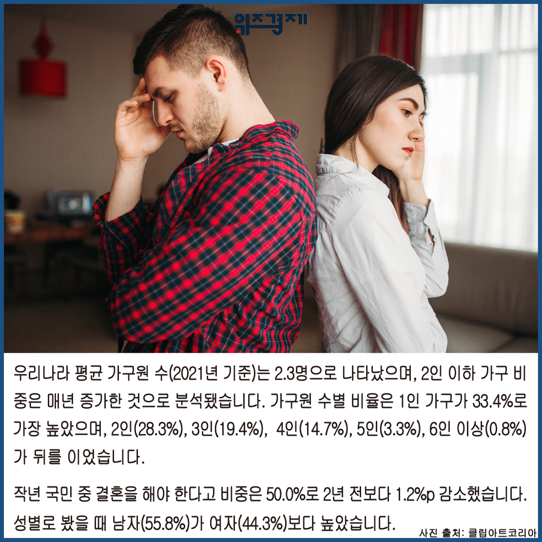 우리나라 평균 가구원 수(2021년 기준)는 2.3명으로 나타났으며, 2인