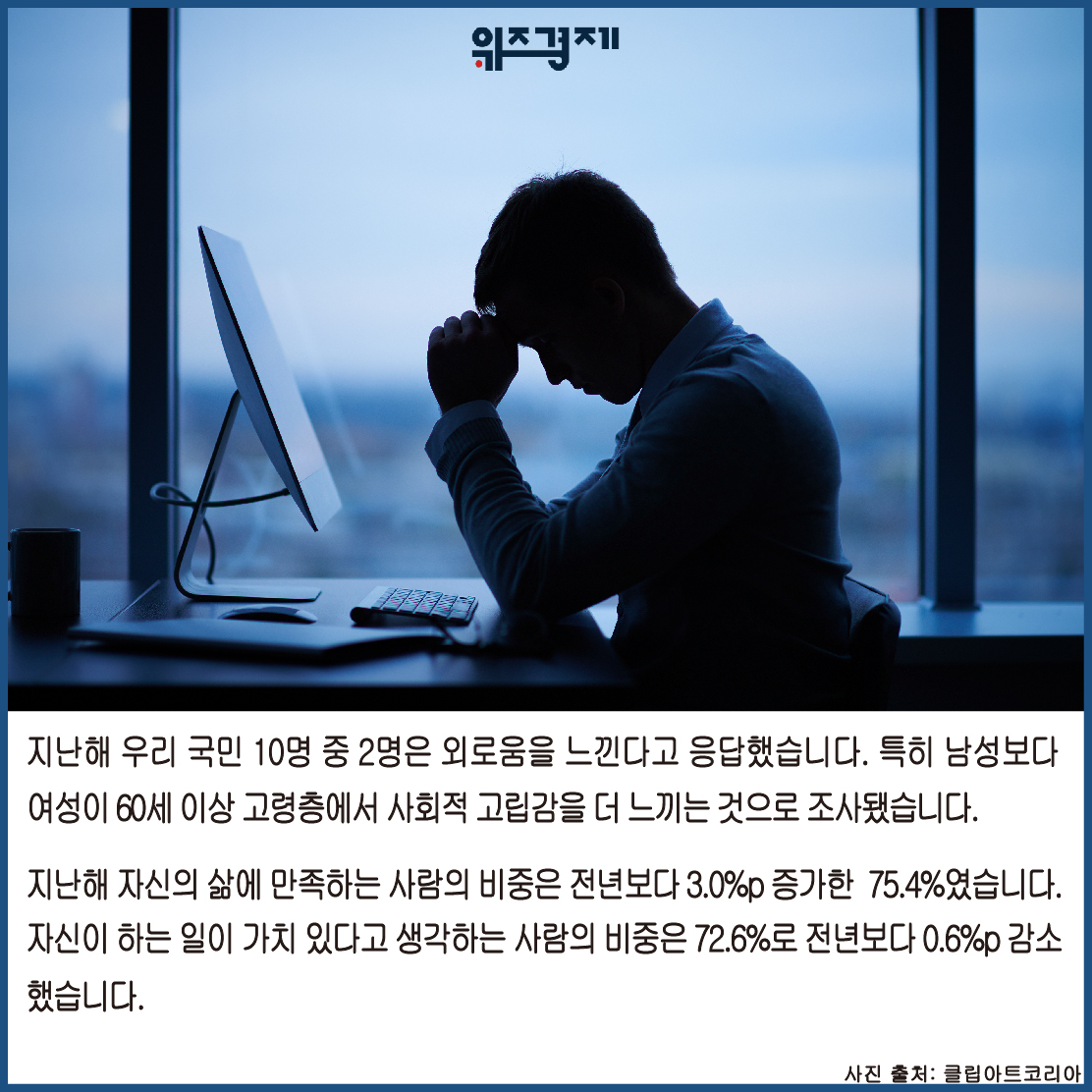 지난해 우리 국민 10명 중 2명은 외로움을 느낀다고 응답했습니다. 특히 남성보다 여성이 60세 이상 고령층에서 사회적 고립감을 더 느끼는 것으로 조사됐습니다.