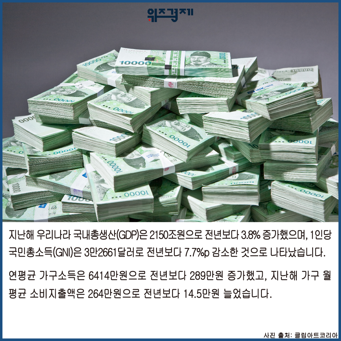우리나라 국내총생산(GDP)은 2150조원으로 전년보다 3.8% 증가했으며, 1인당 국민총소득(GNI)은 3만2661달러로