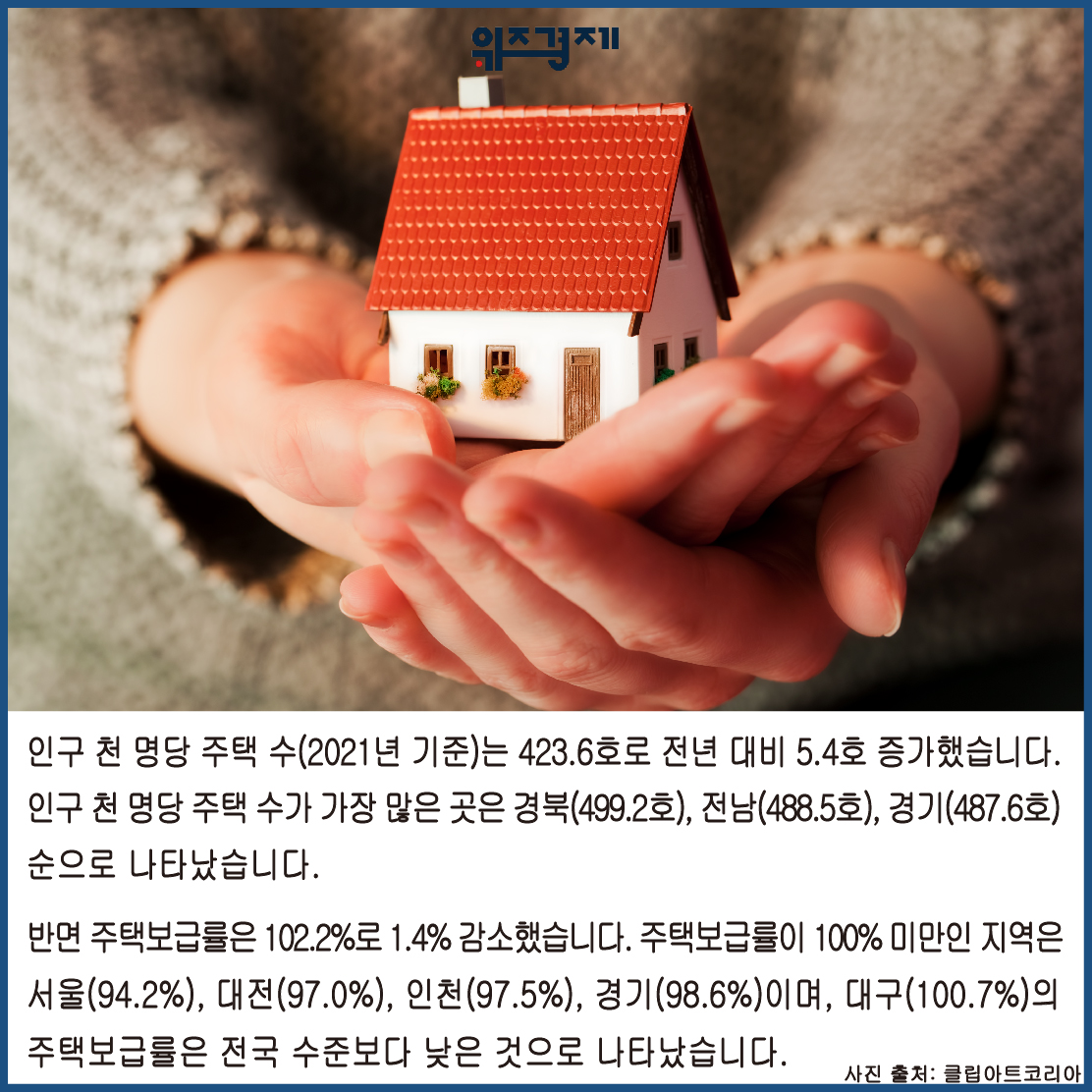천 명당 주택 수(2021년 기준)는 423.6호로 전년 대비 5.4호 증가했습니다. 인구 천 명당 주택 수가 가장 많은 곳은 경북(499.2호), 전남(488.5호), 경기(487.6호) 순으로 나타났습니다.