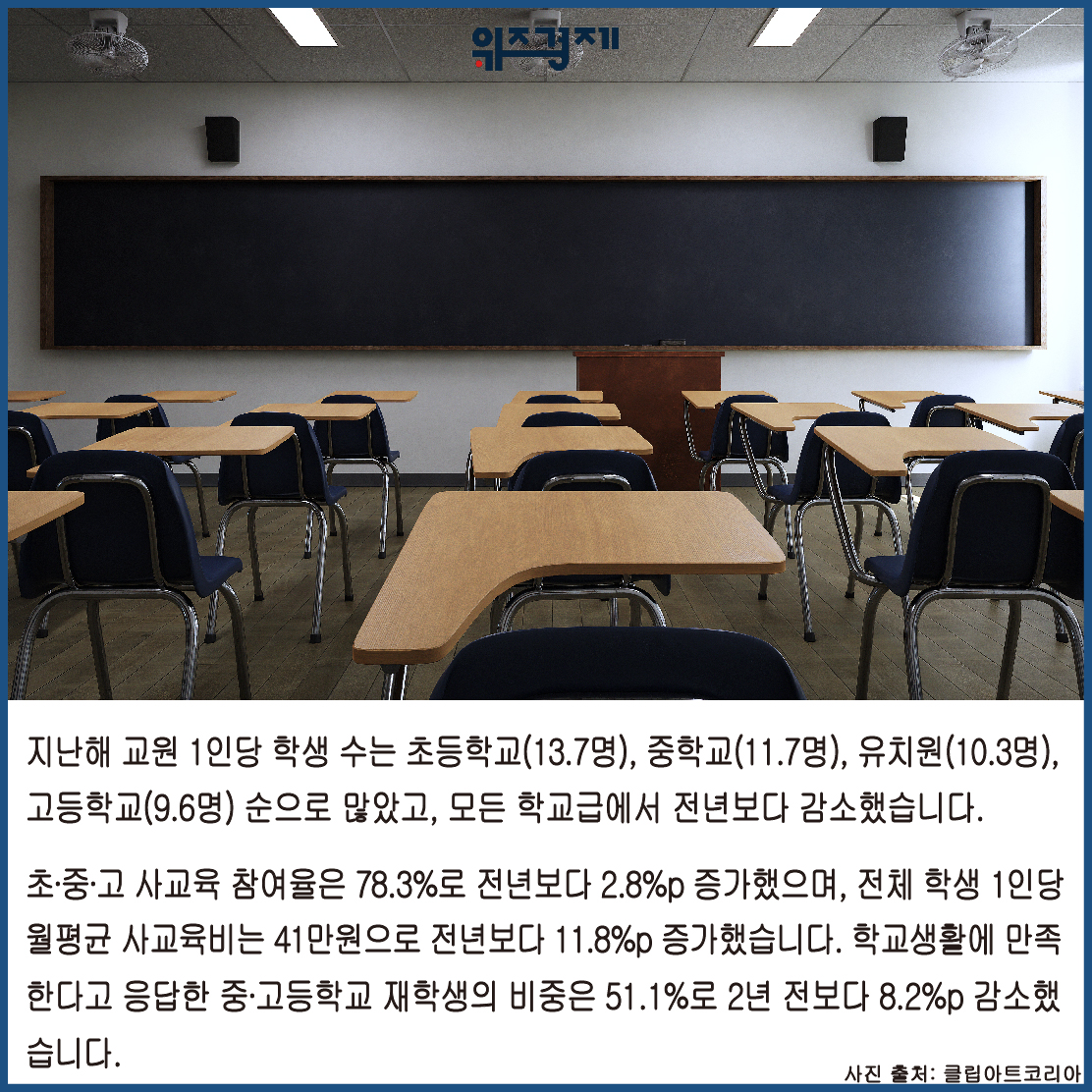 초∙중∙고 사교육 참여율은 78.3%로 전년보다 2.8%p 증가했으며, 전체 학생 1인당 월평균 사교육비는 41만원으로 전년보다 11.8%p 증가했습니다. 학교생활에 만족한다고 응답한 중∙고등학교 재학생의 비중은 51.1%로
