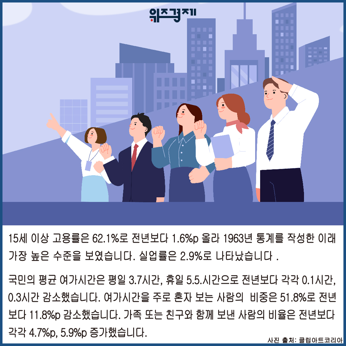 이상 고용률은 62.1%로 전년보다 1.6%p 올라 1963년 통계를 작성한 이래 가장 높은 수준을 보였습니다. 실업률은