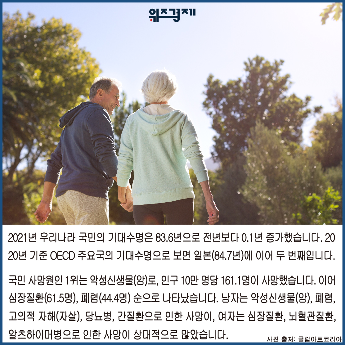 2021년 우리나라 국민의 기대수명은 83.6년으로 전년보다 0.1년 증가했습니다. 2020년 기준 OECD 주요국의 기대수명으로 보면 일본(84.7년)에 이어 두 번째입니다.