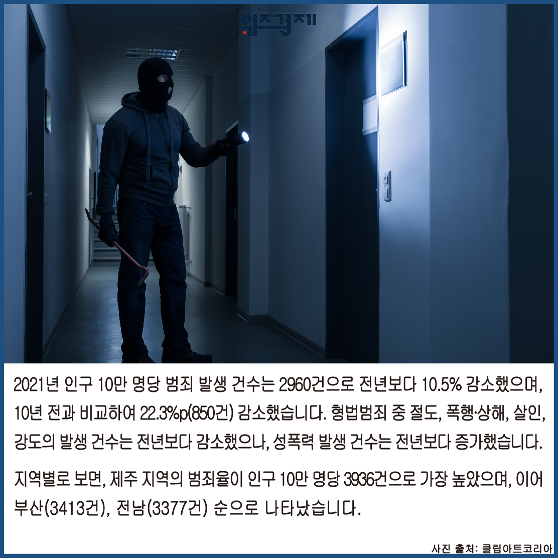 명당 범죄 발생 건수는 2960건으로 전년보다 10.5% 감소했으며, 10년 전과 비교하여 22.3%p(850건) 감소했습니다. 형법범죄 중 절도,