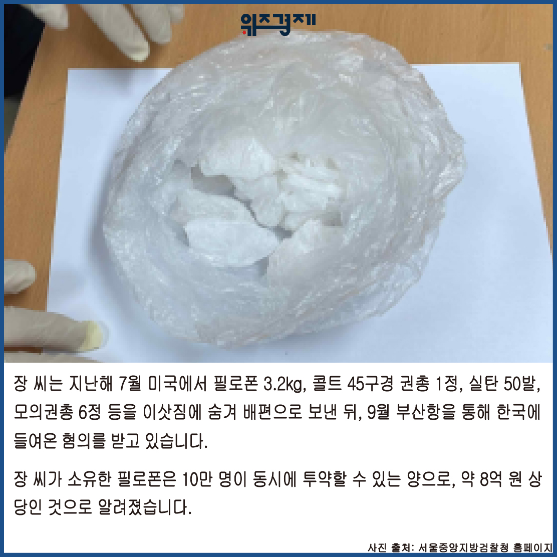 장 씨는 지난해 7월 미국에서 필로폰 3.2kg, 콜트 45구경 권총 1정, 실탄 50발, 모의권총