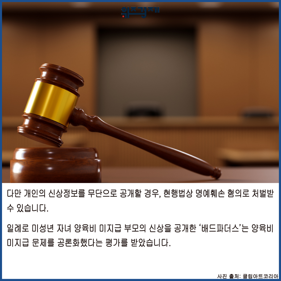 다만 개인의 신상정보를 무단으로 공개할 경우, 현행법상 명예훼손 혐의로