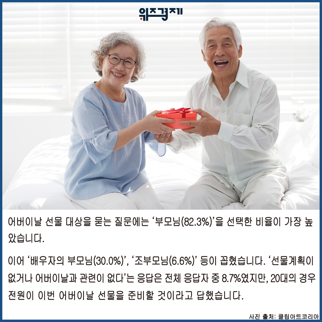어버이날 선물 대상을 묻는 질문에는 ‘부모님(82.3%)’을 선택한 비율이 가장 높았습니다.