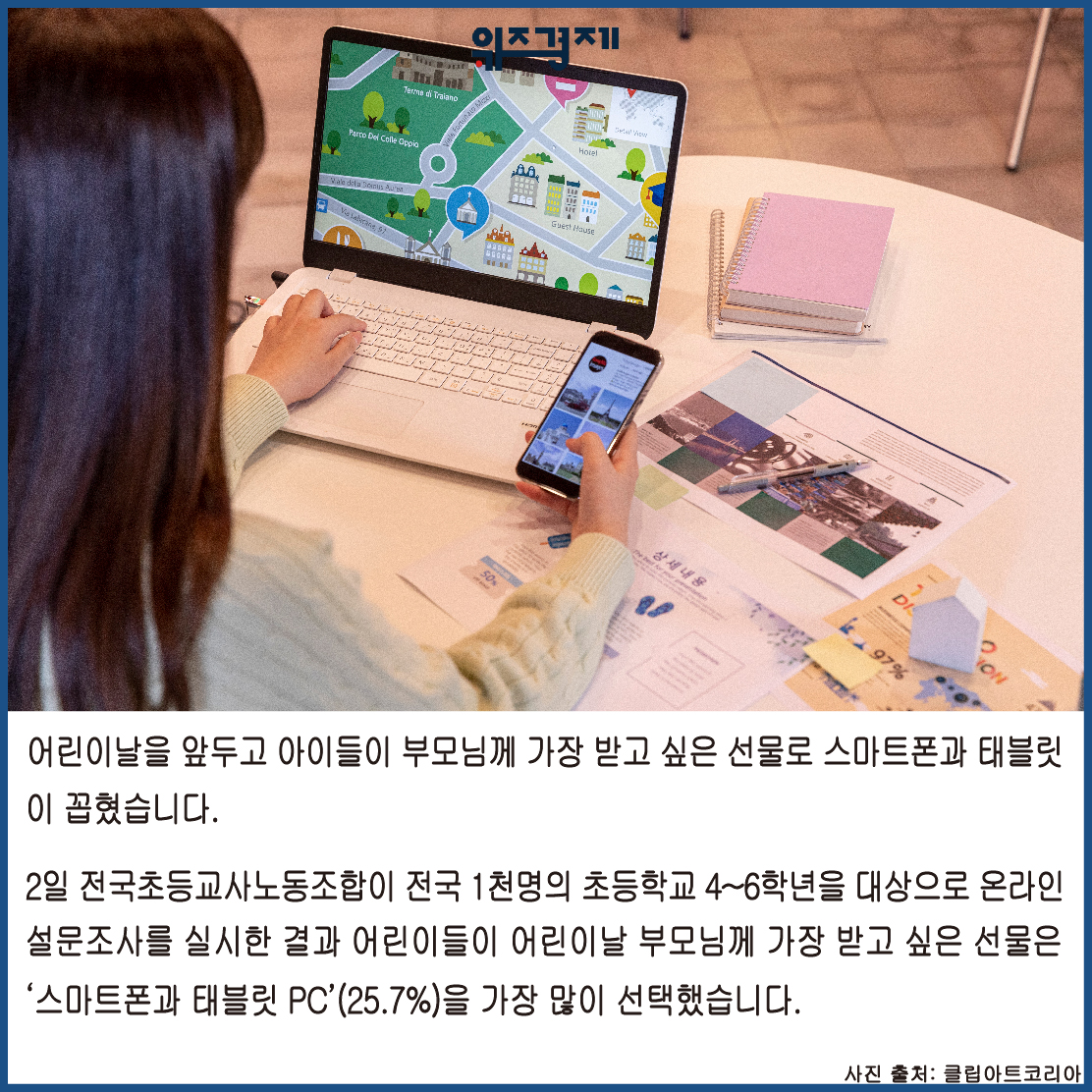 [위즈경제] 이정원 기자 =어린이날을 앞두고 아이들이 부모님께 가장 받고 싶은 선물로 스마트폰과 태블릿이 꼽혔습니다.