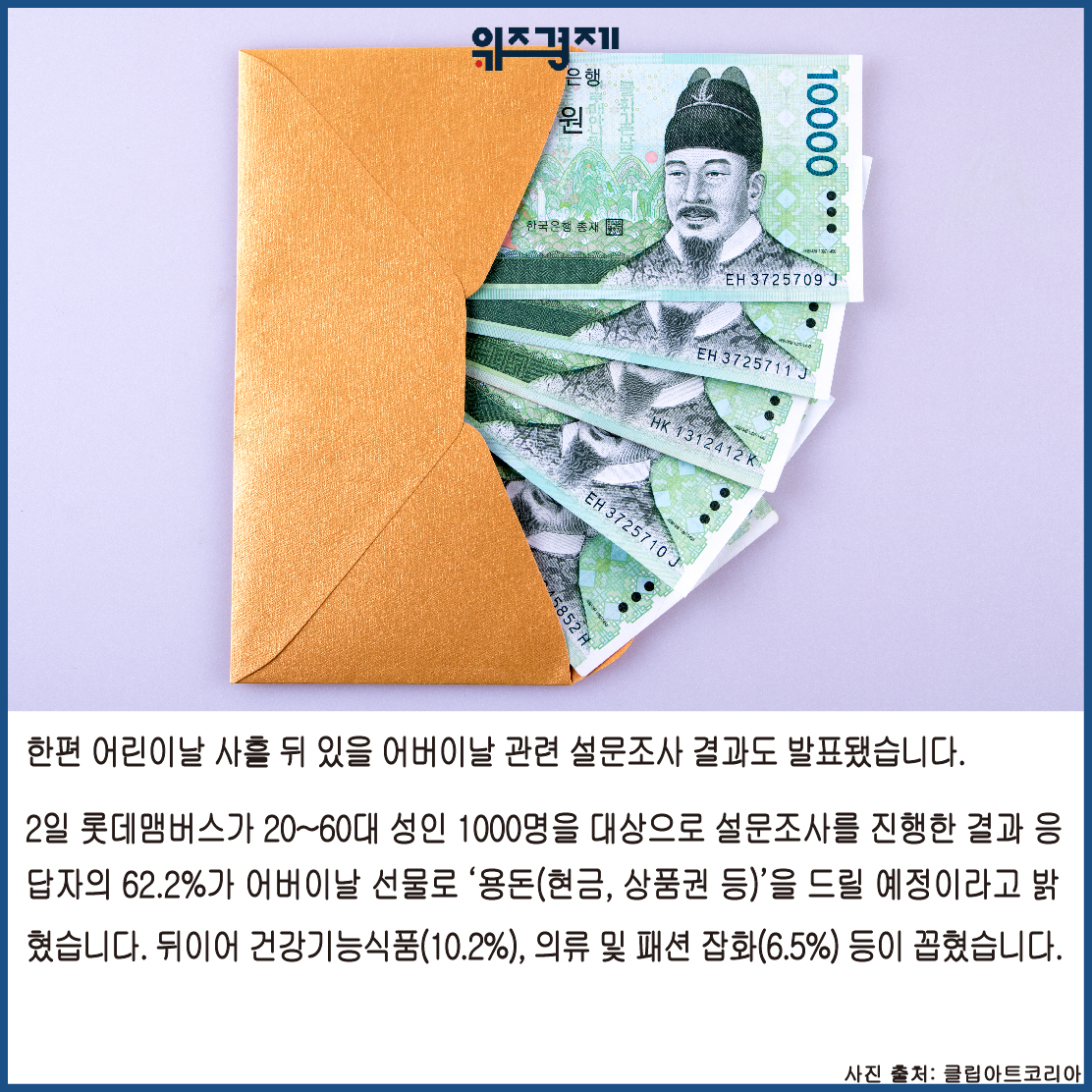 어버이날 선물로 ‘용돈(현금, 상품권 등)’을 드릴 예정이라고 밝혔습니다. 뒤이어 건강기능식품(10.2%), 의류 및 패션 잡화(6.5%) 등이 꼽혔습니다.