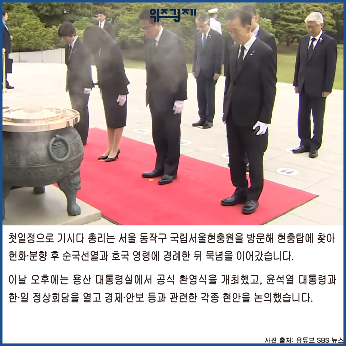 첫일정으로 기시다 총리는 서울 동작구 국립서울현충원을 방문해 현충탑에 찾아 헌화∙분향 후 순국선열과