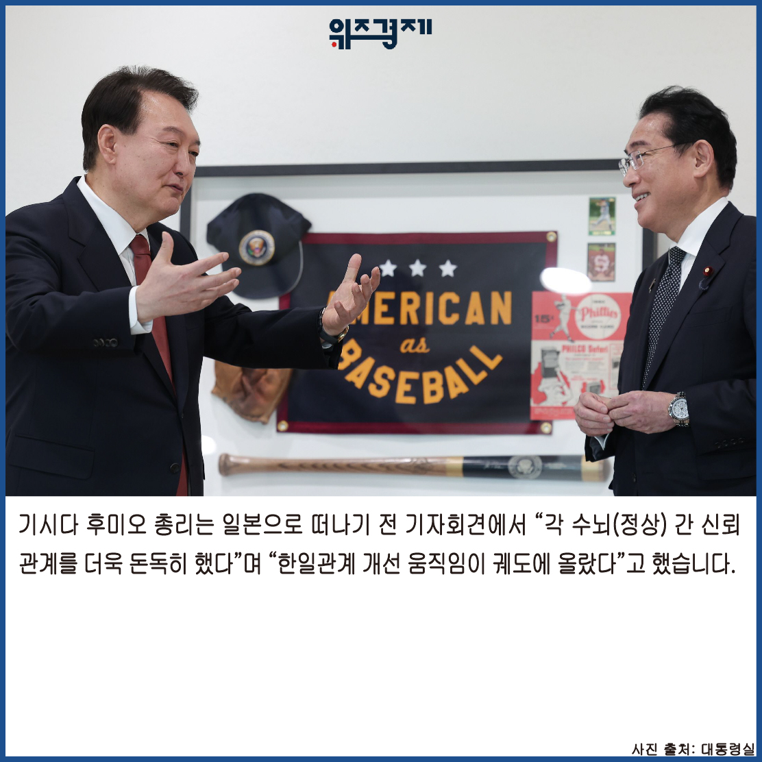 수뇌(정상) 간 신뢰관계를 더욱 돈독히 했다”며 “한일관계 개선 움직임이 궤도에 올랐다”고 했습니다.