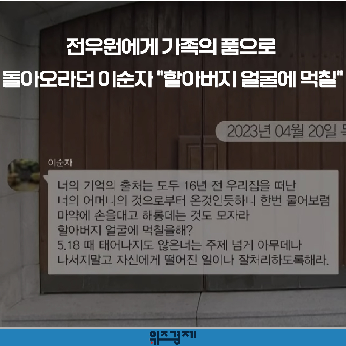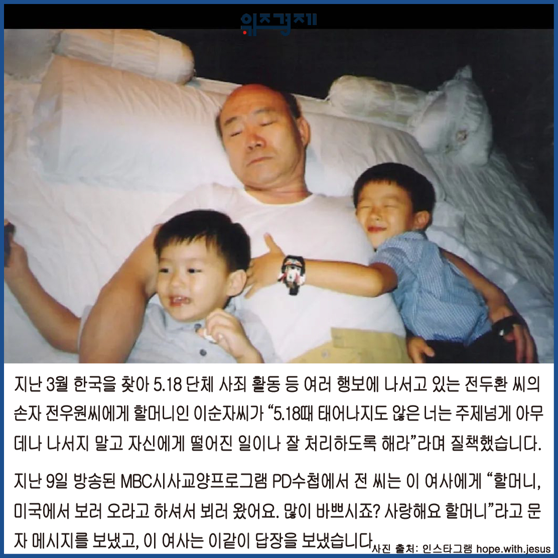 [위즈경제] 이정원 기자 =지난 3월 한국을 찾아 5.18 단체 사죄 활동 등 여러 행보에 나서고 있는 전두환 씨의 손자 전우원씨에게 할머니인 이순자씨가 “5.18때 태어나지도 않은 너는 주제넘게 아무데나 나서지 말고 자신에게 떨어진 일이나 잘 처리하도록 해라”라며 질책했습니다.