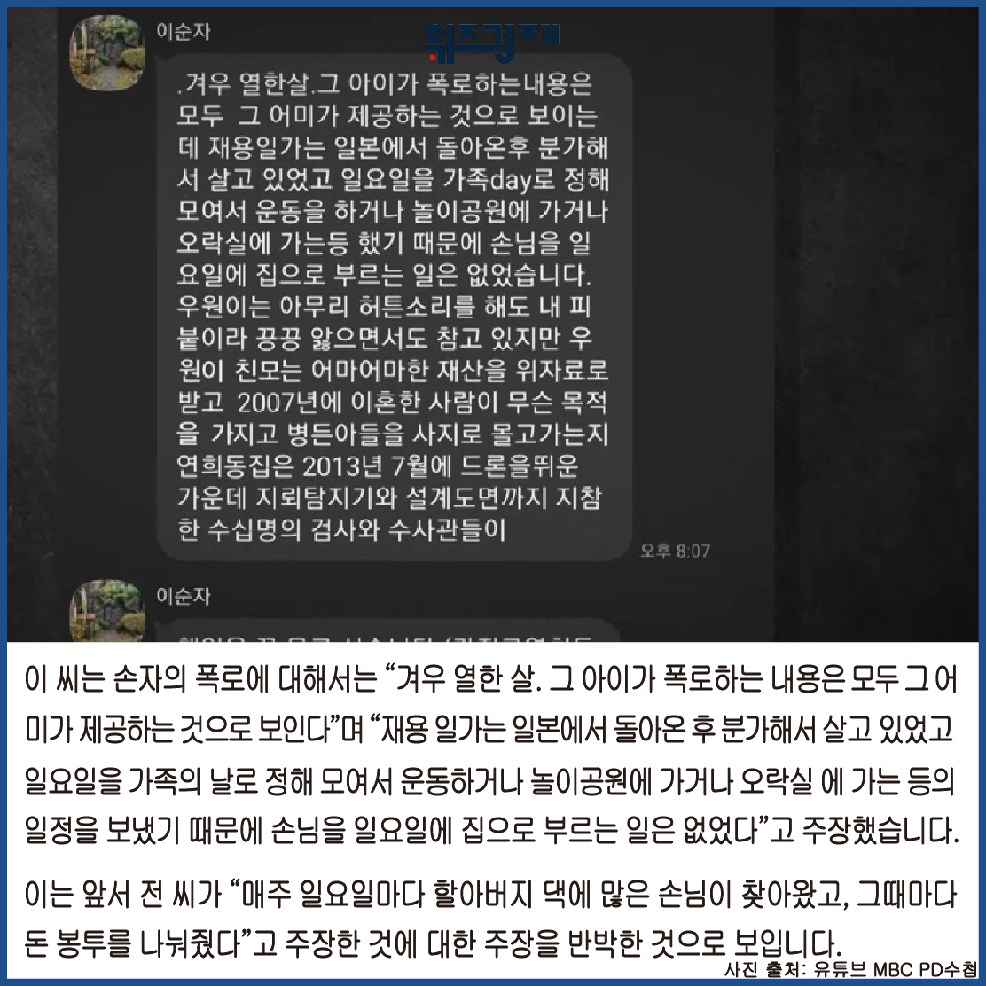 이 씨는 손자의 폭로에 대해서는 “겨우 열한 살. 그 아이가 폭로하는 내용은 모두 그 어미가 제공하는 것으로 보인다”며