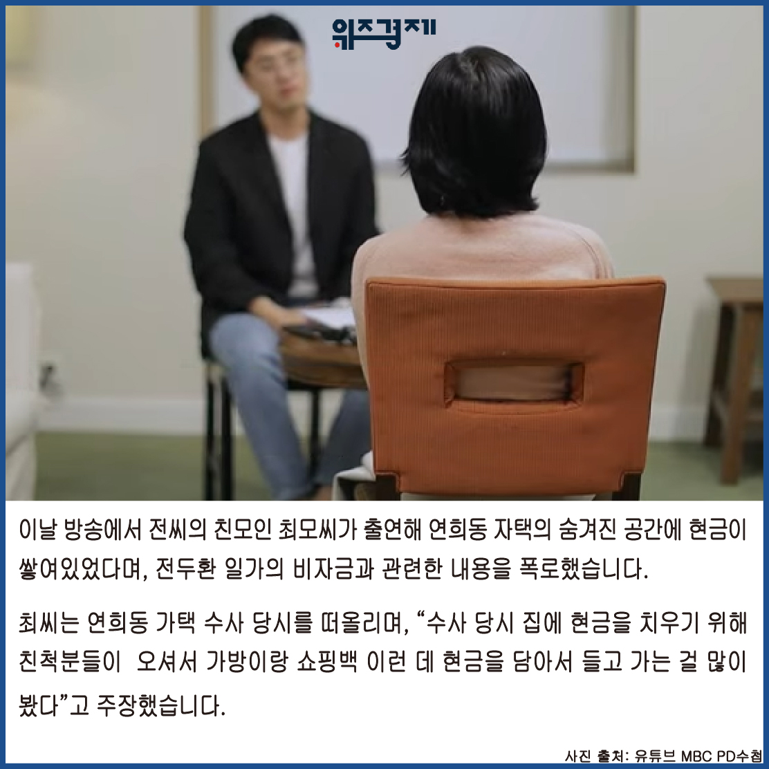 이날 방송에서 전씨의 친모인 최모씨가 출연해 연희동 자택의 숨겨진 공간에 현금이 쌓여있었다며, 전두환 일가의 비자금과 관련한 내용을 폭로했습니다.