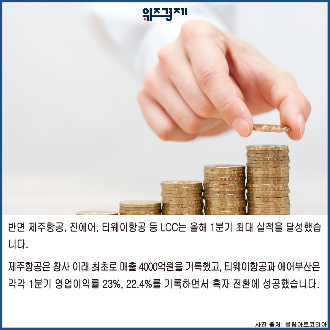 제주항공은 창사 이래 최초로 매출 4000억원을 기록했고, 티웨이항공과 에어부산은 각각 1분기 영업이익률 23%, 22.4%를 기록하면서 흑자 전환에 성공했습니다.