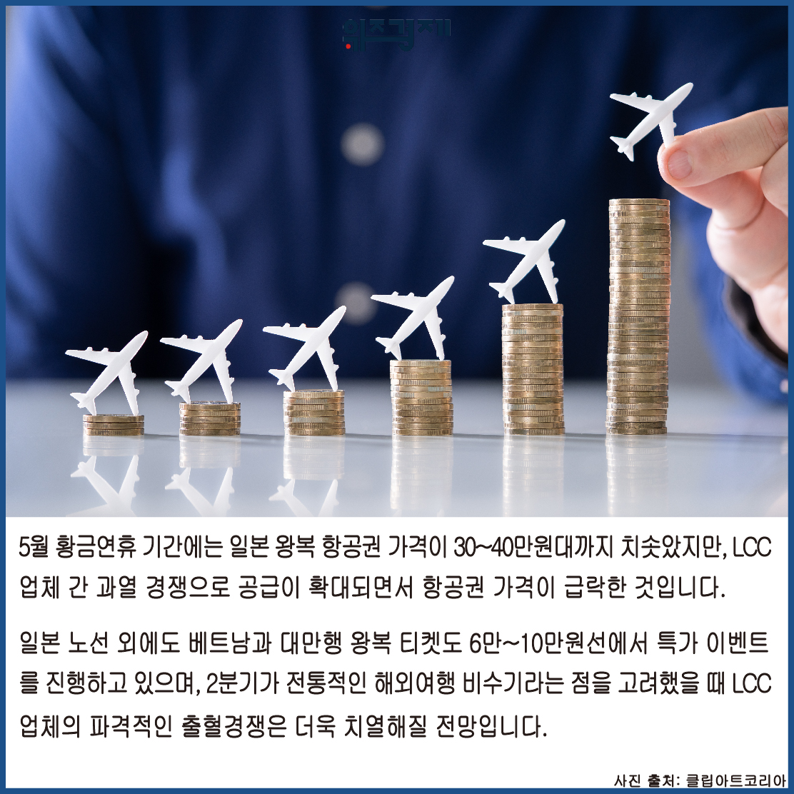 5월 황금연휴 기간에는 일본 왕복 항공권 가격이 30~40만원대까지 치솟았지만, LCC 업체 간 과열 경쟁으로 공급이