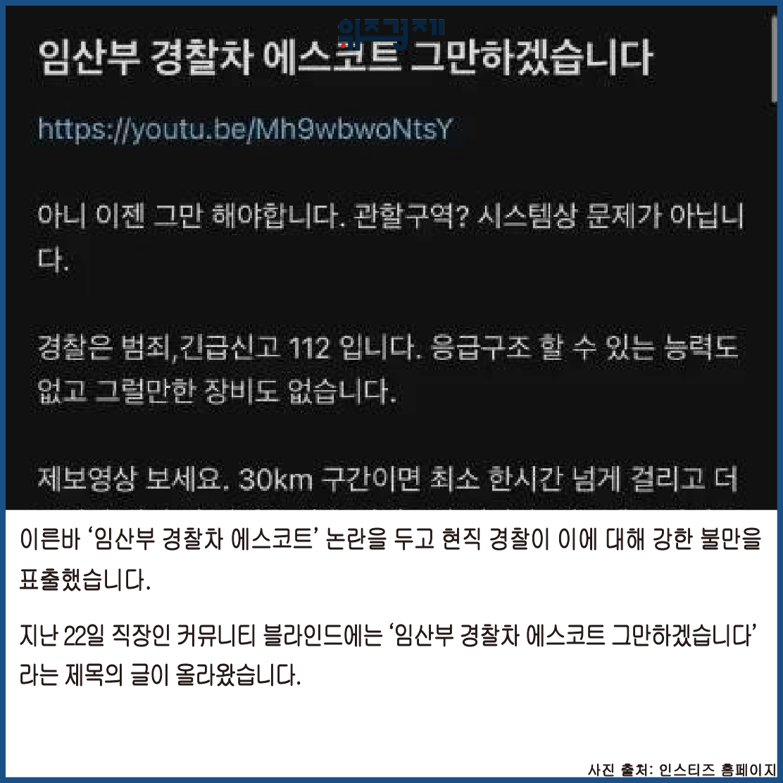 [위즈경제] 이정원 기자 =이른바 ‘임산부 경찰차 에스코트’ 논란을 두고 현직 경찰이 이에 대해 강한 불만을 표출했습니다.