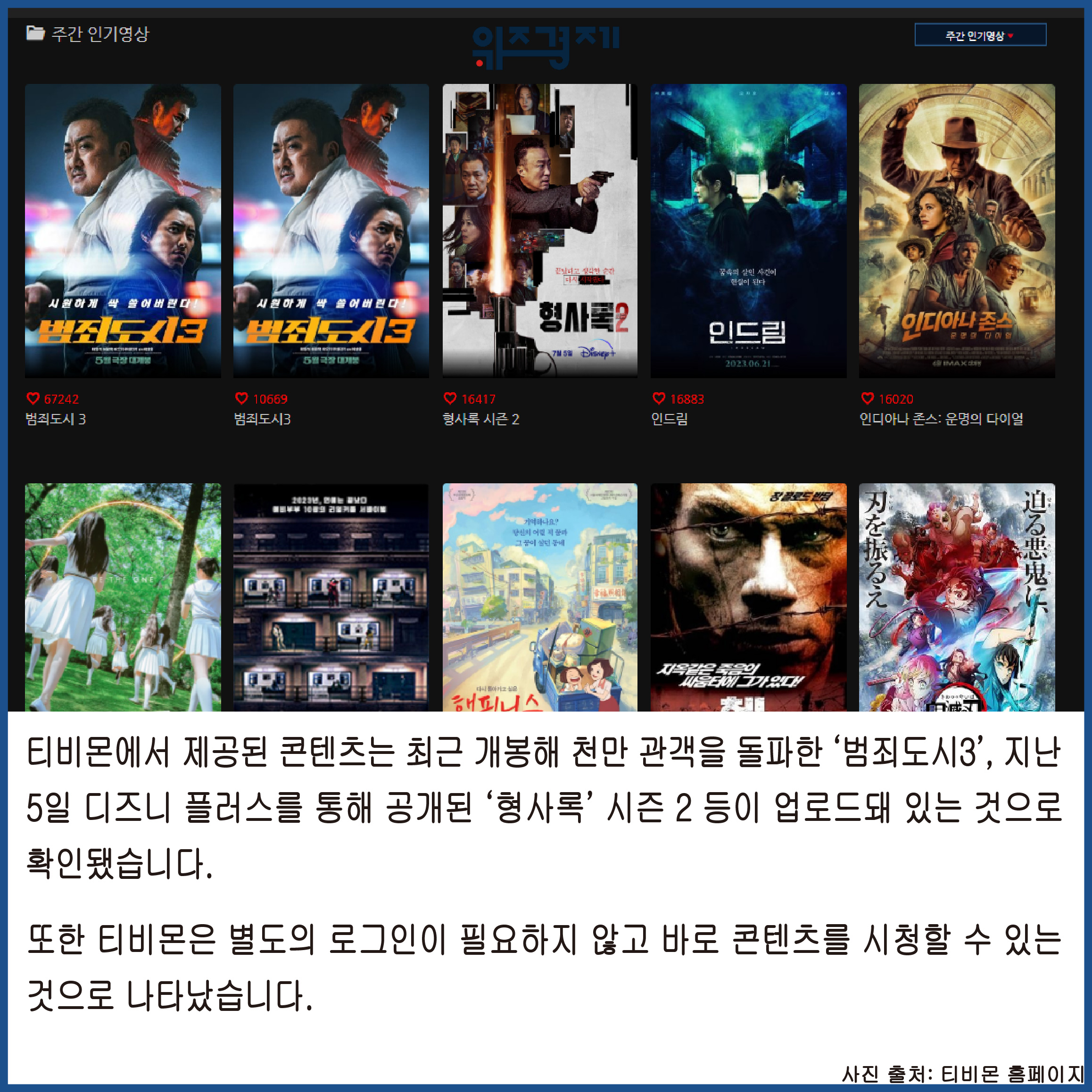 티비몬에서 제공된 콘텐츠는 최근 개봉해 천만 관객을 돌파한 ‘범죄도시3’, 지난 5일 디즈니 플러스를 통해 공개된 ‘형사록’ 시즌 2 등이