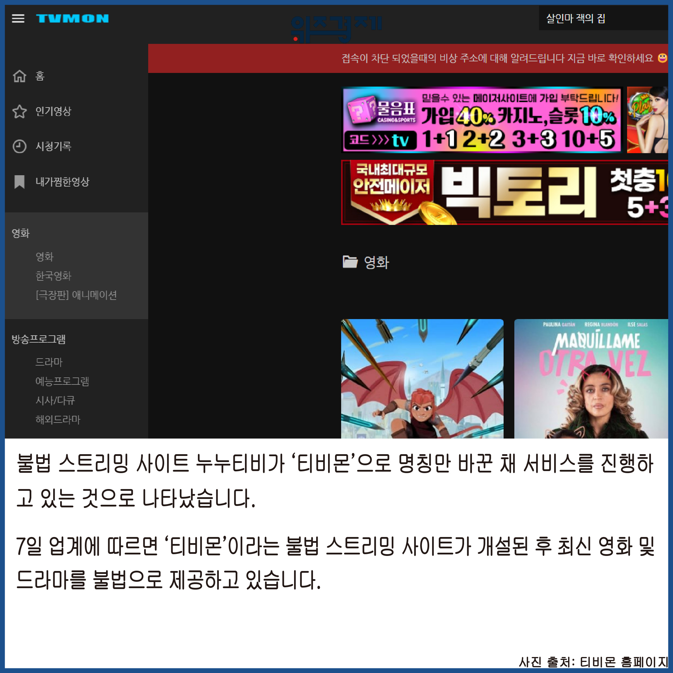 [위즈경제] 이정원 기자 =불법 스트리밍 사이트 누누티비가 ‘티비몬’으로 명칭만 바꾼 채 서비스를 진행하고 있는 것으로 나타났습니다.