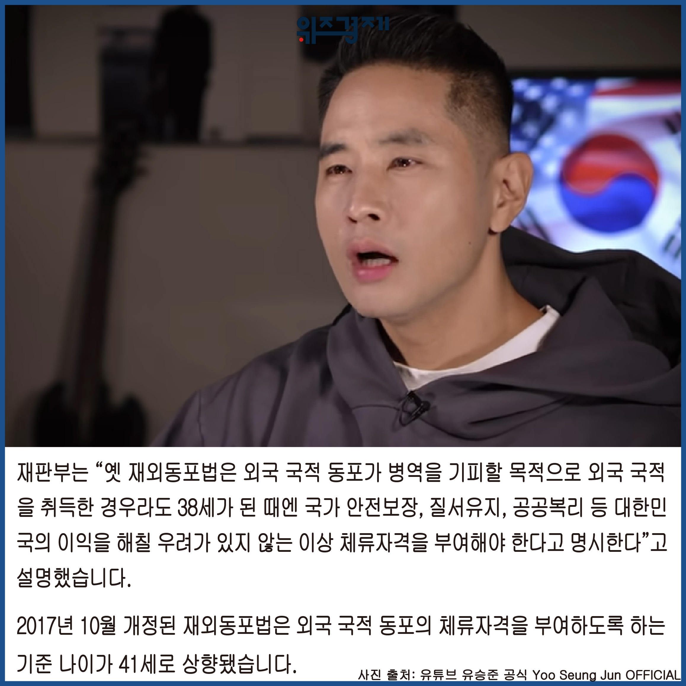 “옛 재외동포법은 외국 국적 동포가 병역을 기피할 목적으로 외국 국적을 취득한 경우라도 38세가 된 때엔 국가 안전보장, 질서유지, 공공복리 등 대한민국의 이익을 해칠 우려가 있지 않는 이상 체류자격을 부여해야 한다고 명시한다”고 설명했습니다.