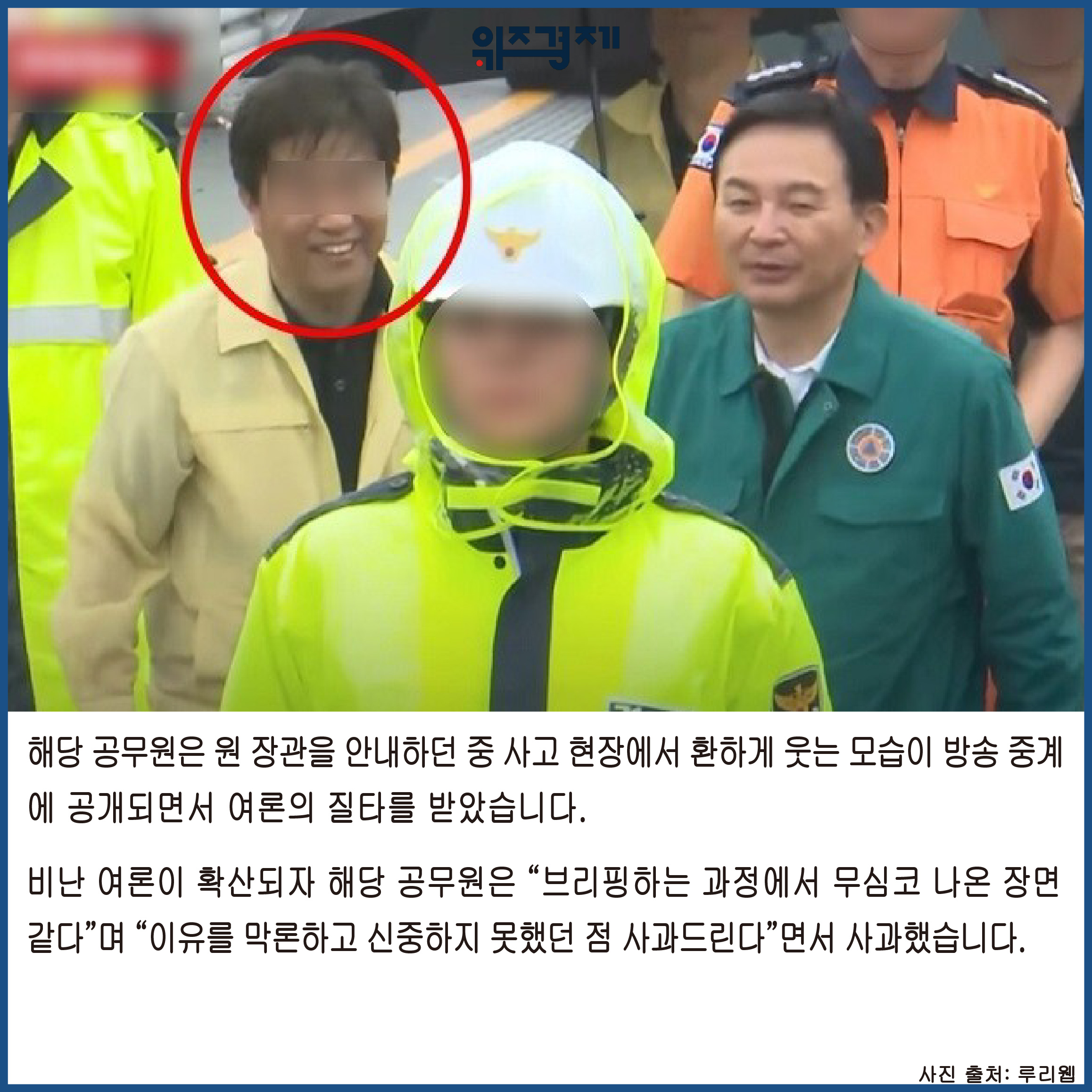 해당 공무원은 원 장관을 안내하던 중 사고 현장에서 환하게 웃는 모습이 방송 중계에 공개되면서 여론의 질타를