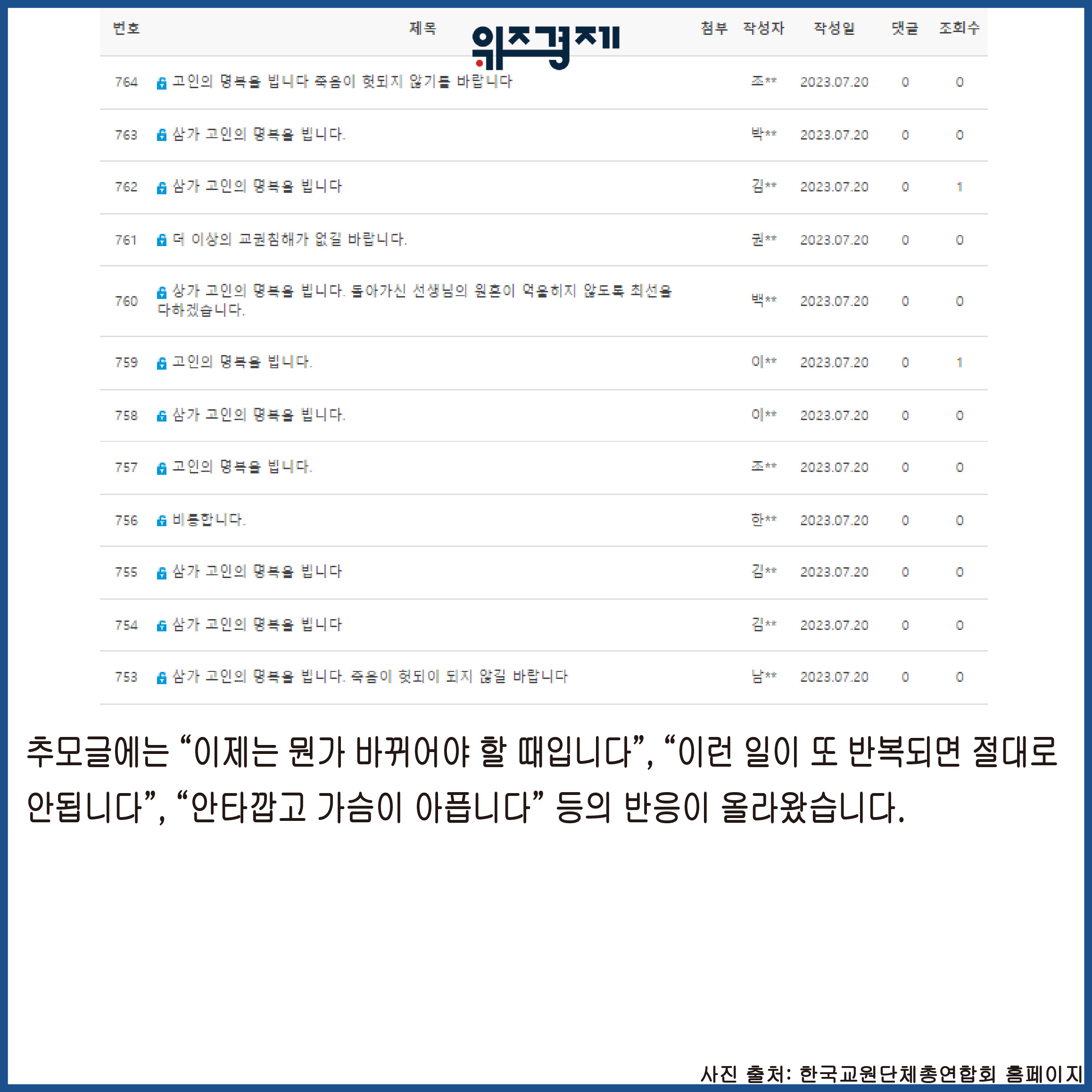 [위즈경제] 이정원 기자 =서울 서초구 서이초등학교 교사가 극단적 선택을 한 사건이 벌어진 가운데 한국교원단체총연합회는 철저한 진상규명과 대책 마련을 촉구했습니다.