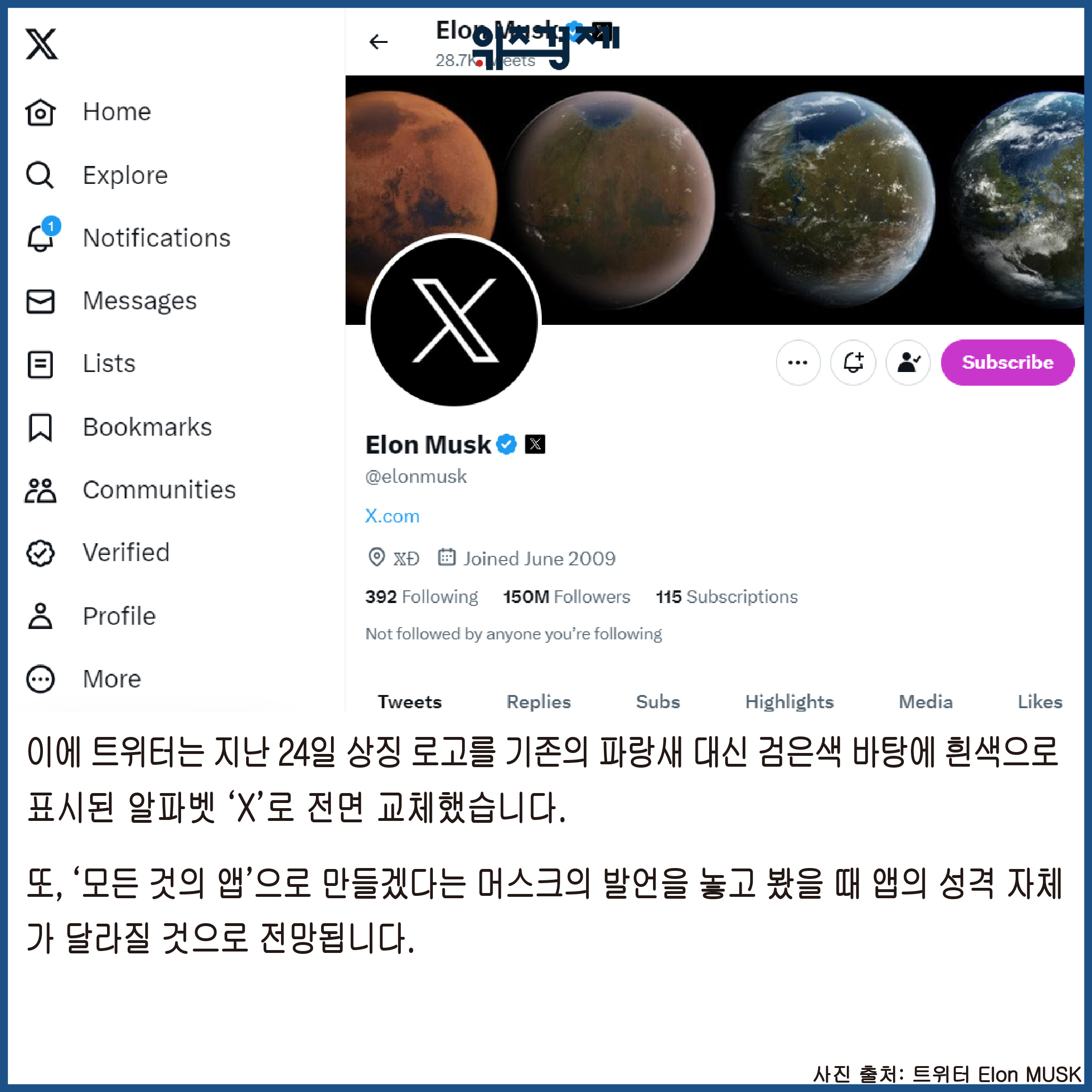 [위즈경제] 이정원 기자 =최근 트위터가 사명을 ‘X’로 바꾼 가운데 일론 머스크 테슬라 최고경영자(CEO)가 16년 동안 트위터에서 ‘X’ 아이디로 활동한 유저의 계정을 빼앗았다는 주장이 제기됐습니다.