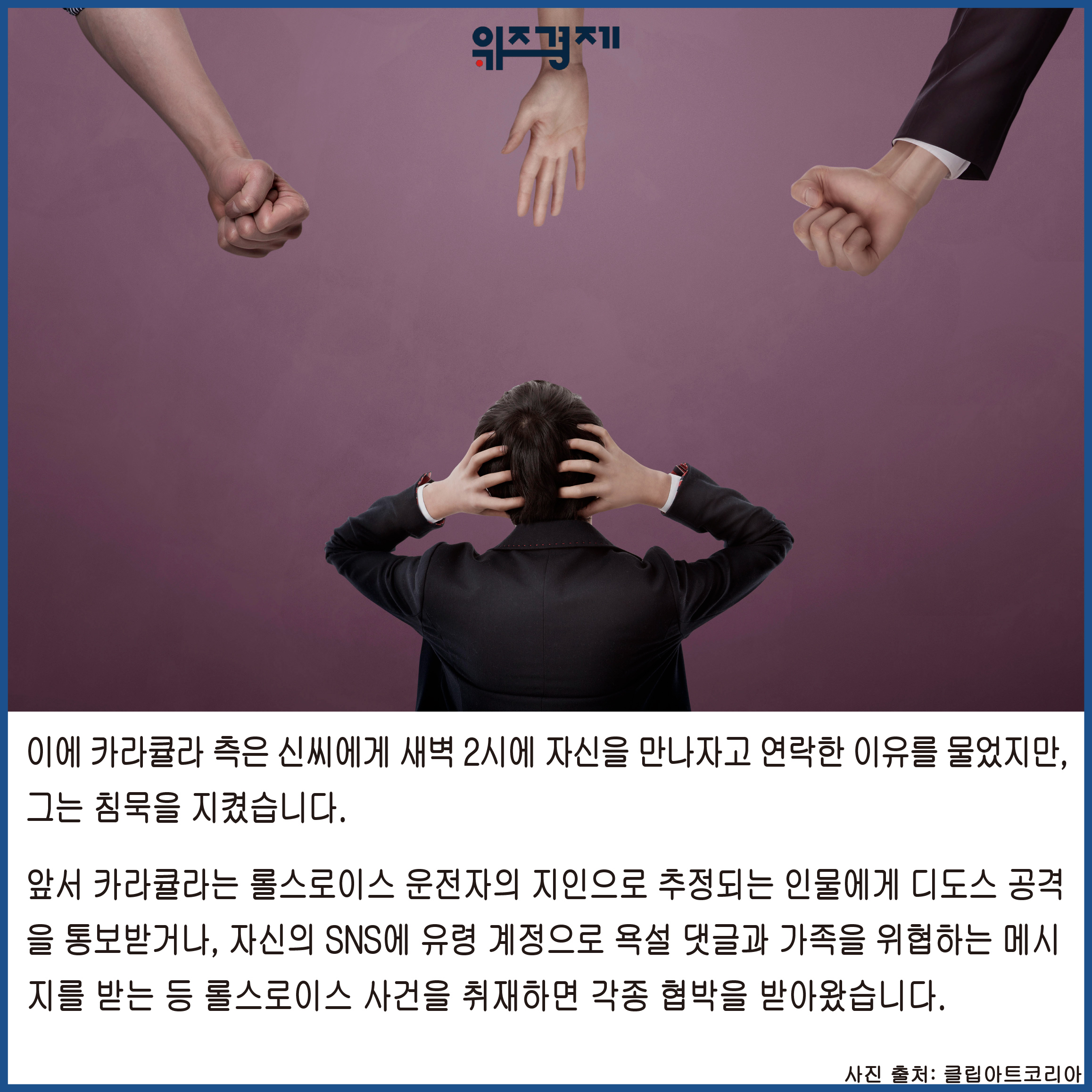 앞서 카라큘라는 롤스로이스 운전자의 지인으로 추정되는 인물에서 디도스 공격을 통보받거나, 자신의 SNS에 유령 계정으로 욕설 댓글과 가족을 위협하는 메시지를