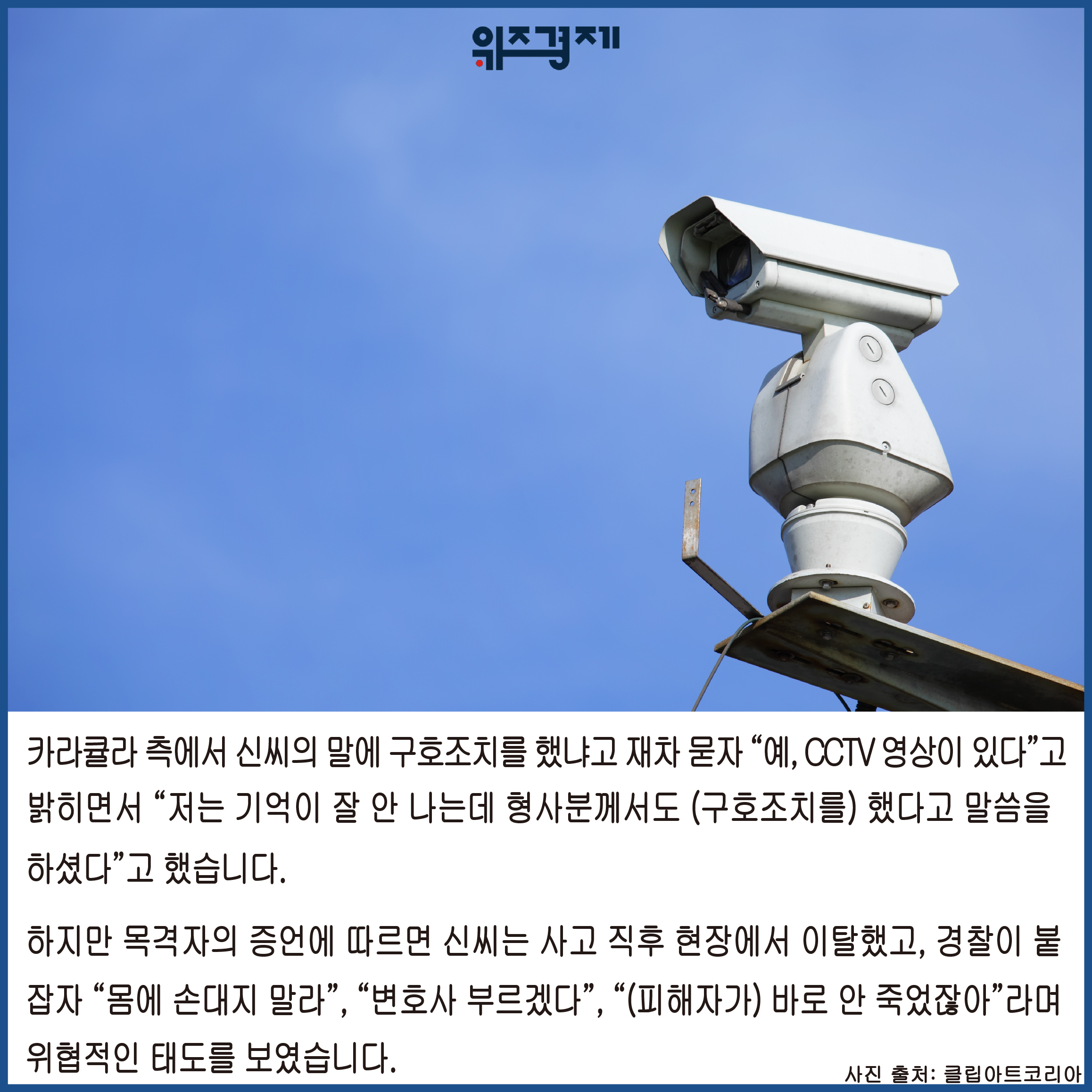 카라큘라 측에서 신씨의 말에 구호조치를 했냐고 재차 묻자 “예, CCTV 영상이 있다”고 밝히면서 “저는 기억이 잘 안 나는데 형사분께서도 (구호 조치를) 했다고 말씀을 하셨다”고 했습니다.