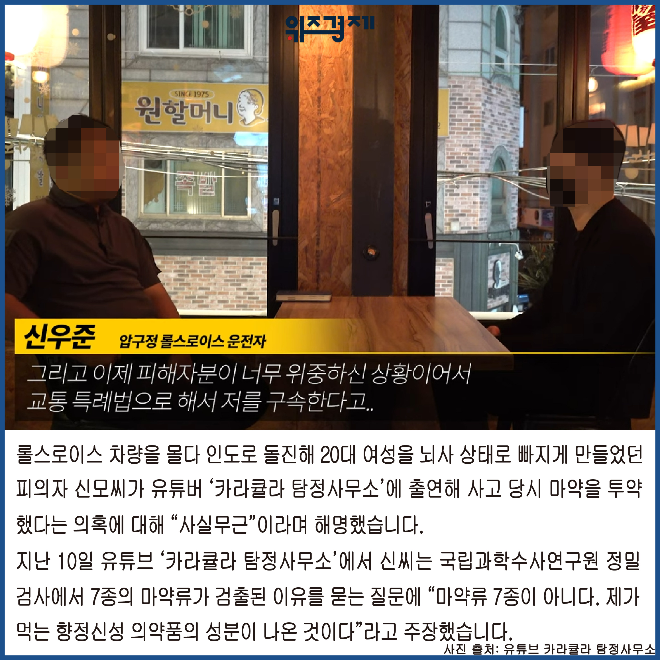 [위즈경제] 이정원 기자 =롤스로이스 차량을 몰다 인도로 돌진해 20대 여성을 뇌사 상태로 빠지게 만들었던 피의자 신모씨가 유튜버 ‘카라큘라 탐정사무소’에 출연해 사고 당시 마약을 투약했다는 의혹에 대해 “사실무근”이라며 해명했습니다.