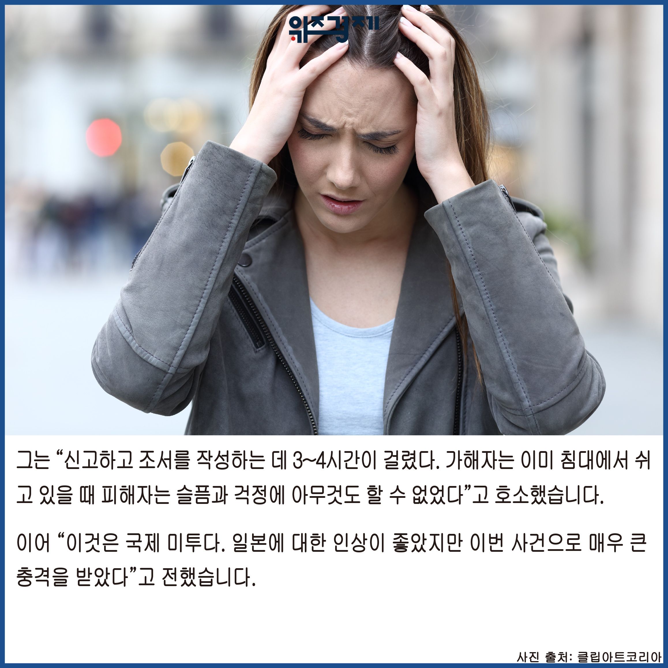 그는 “신고하고 조서를 작성하는 데 3~4시간이 걸렸다. 가해자는 이미 침대에서 쉬고 있을 때 피해자는