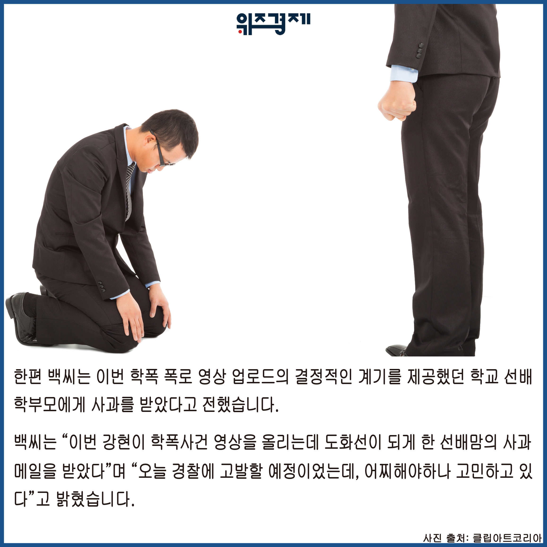 한편 백씨는 이번 학폭 폭로 영상 업로드의 결정적인 계기를 제공했던 학교 선배 학부모에게 사과를 받았다고 전했습니다.