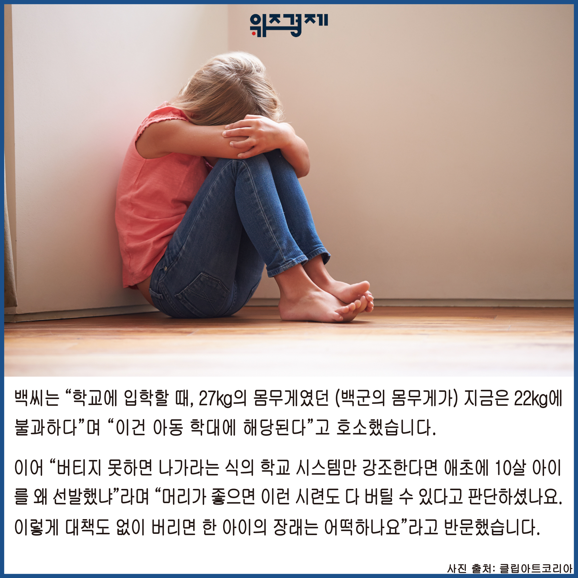 백씨는 “학교에 입학할 때, 27kg의 몸무게였던 (백군의 몸무게가) 지금은 22kg에 불과하다”며