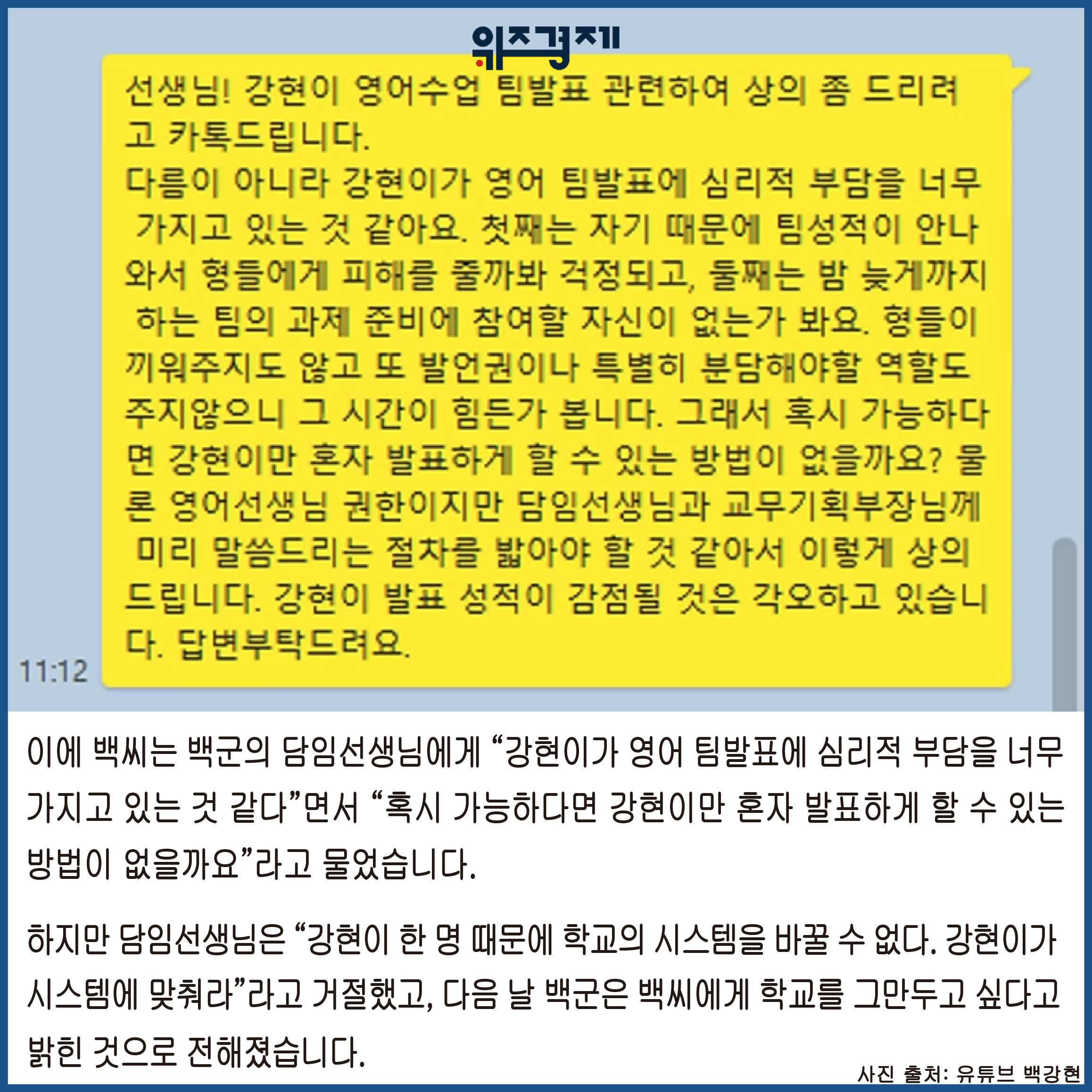 이에 백씨는 백군의 담임선생님에게 “강현이가 영어 팀발표에