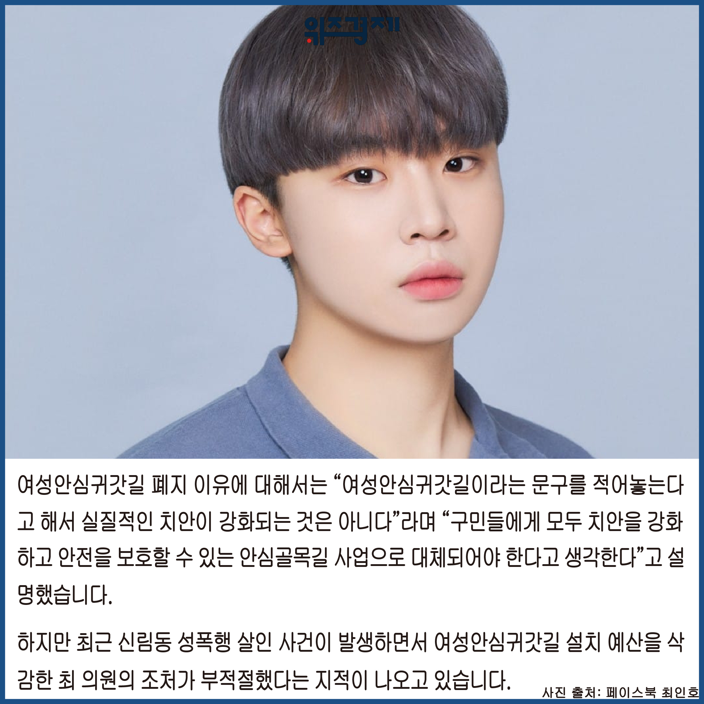의원의 여성안심귀갓길 관련 영상에는 “관악구 구의원 최인호씨! 쓸데없는 예산이라더니 이게 그 결과입니까? 책임지고 피해자한테 사죄하세요”, “여성안심귀갓길