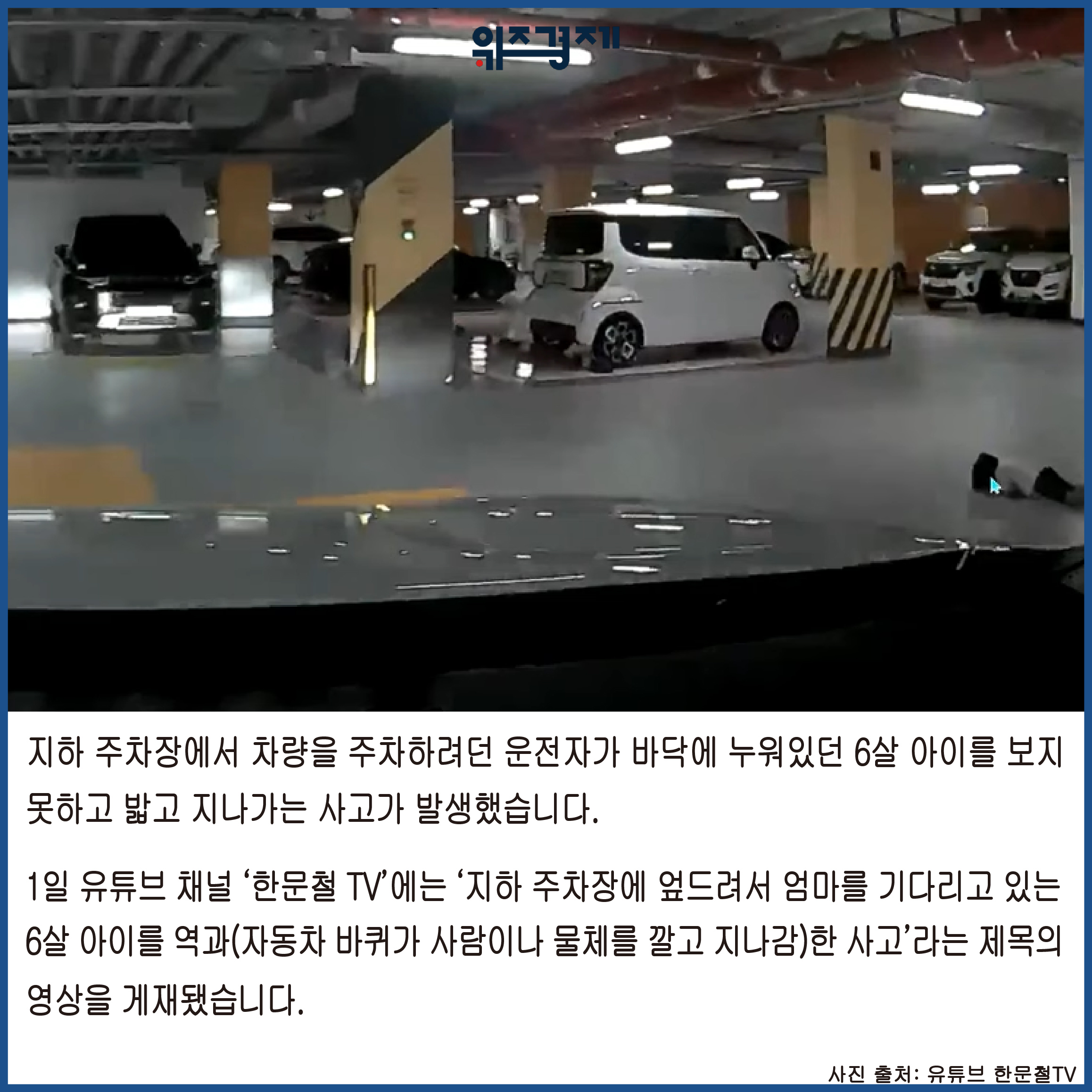 [위즈경제] 이정원 기자 =지하 주차장에서 차량을 주차하려던 운전자가 바닥에 누워있던 6살 아이를 보지 못하고 밟고 지나가는 사고가 발생했습니다.