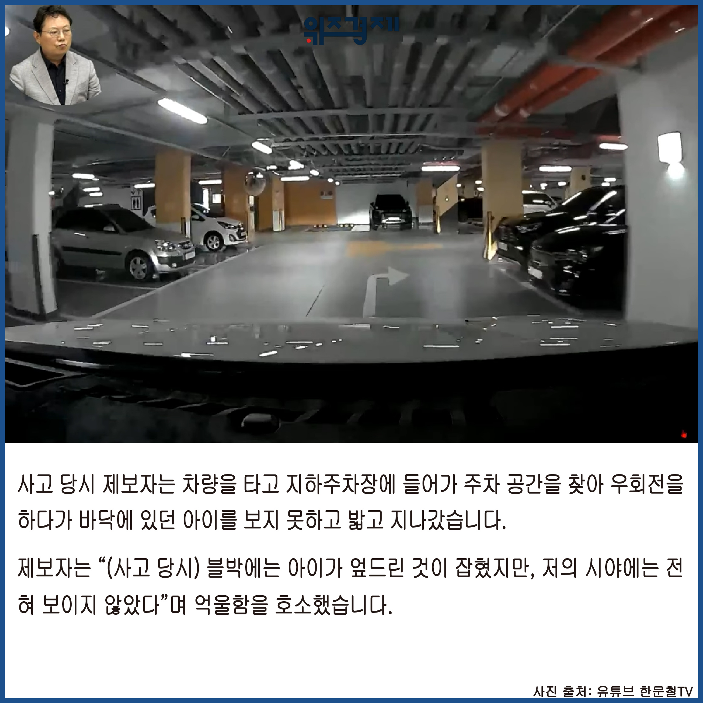 사고 당시 제보자는 차량을 타고 지하주차장에 들어가 주차 공간을 찾아 우회전을 하다가 바닥에 있던 아이를 보지