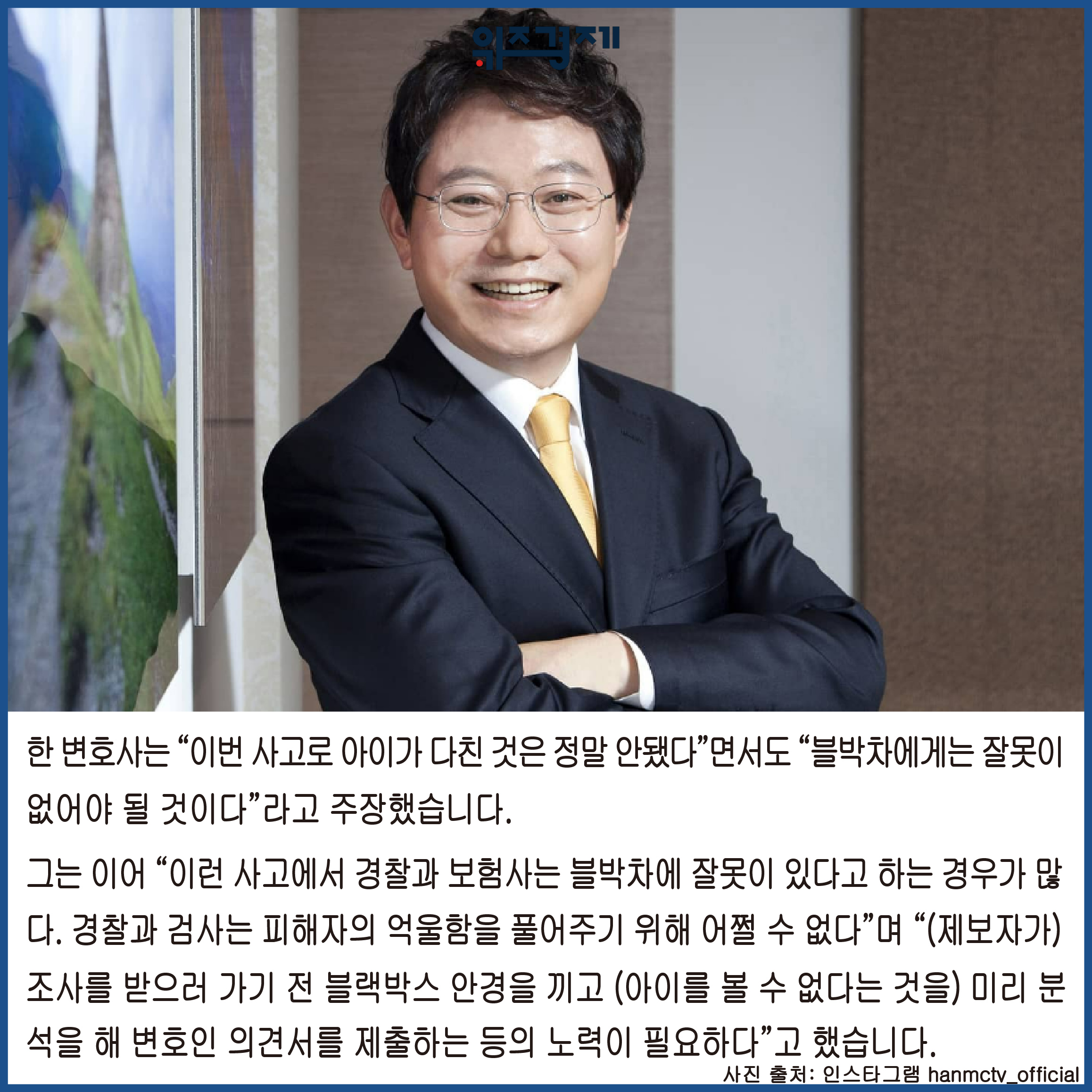 한 변호사는 “이번 사고로 아이가 다친 것은 정말 안됐다”면서도 “블박차에게는 잘못이 없어야 될 것이다”라고 주장했습니다.