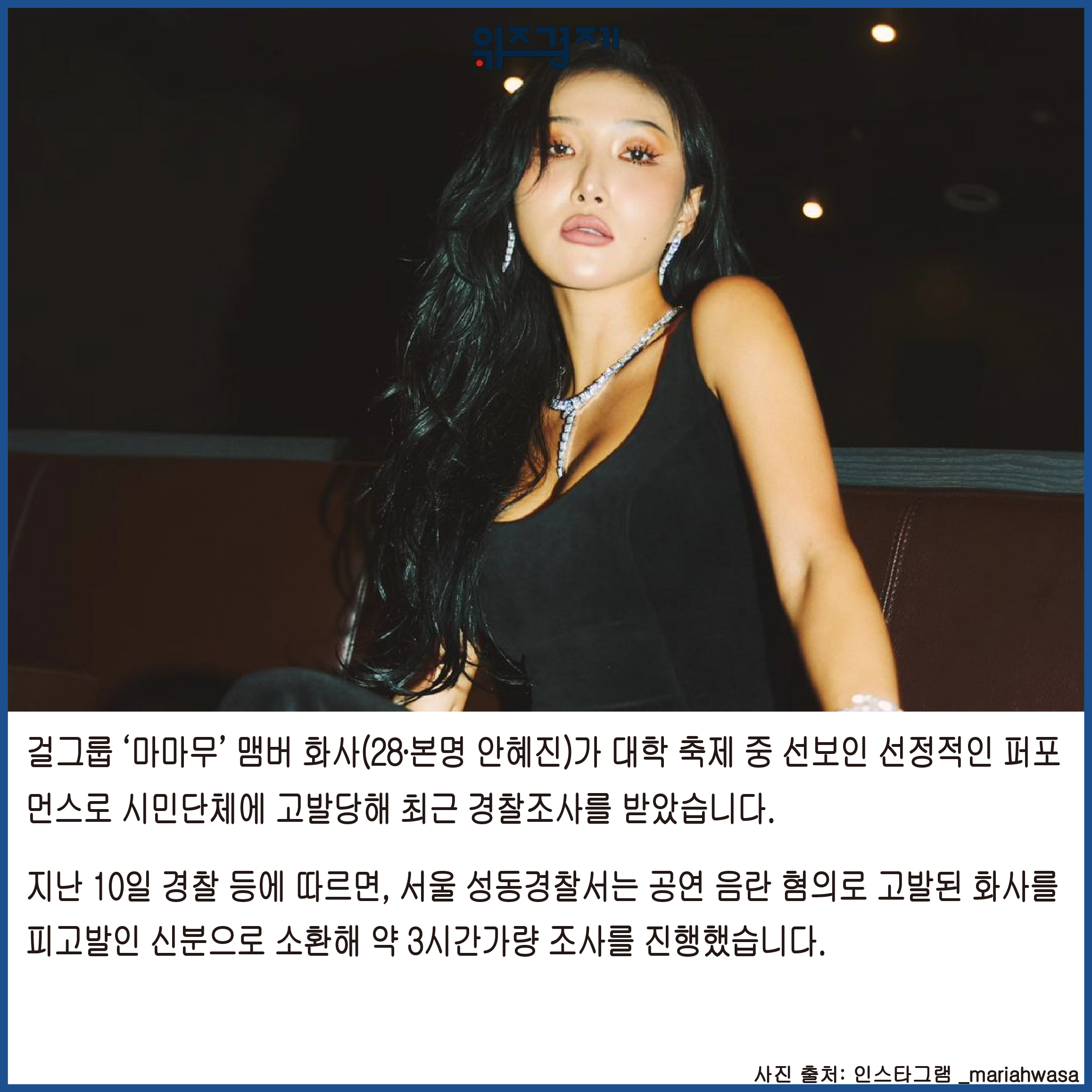 [위즈경제] 이정원 기자 =걸그룹 ‘마마무’ 맴버 화사(28∙본명 안혜진)가 대학 축제 중 선보인 선정적인 퍼포먼스로 시민단체에 고발당해 최근 경찰조사를 받았습니다.