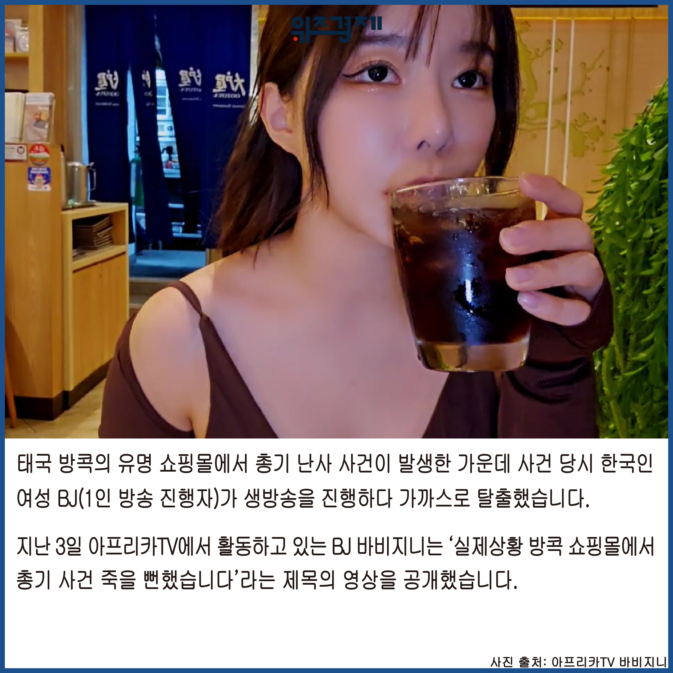 [위즈경제] 이정원 기자 =태국 방콕의 유명 쇼핑몰에서 총기 난사 사건이 발생한 가운데 사건 당시 한국인 여성 BJ(1인 방송 진행자)가 생방송을 진행하다 가까스로 탈출했습니다.