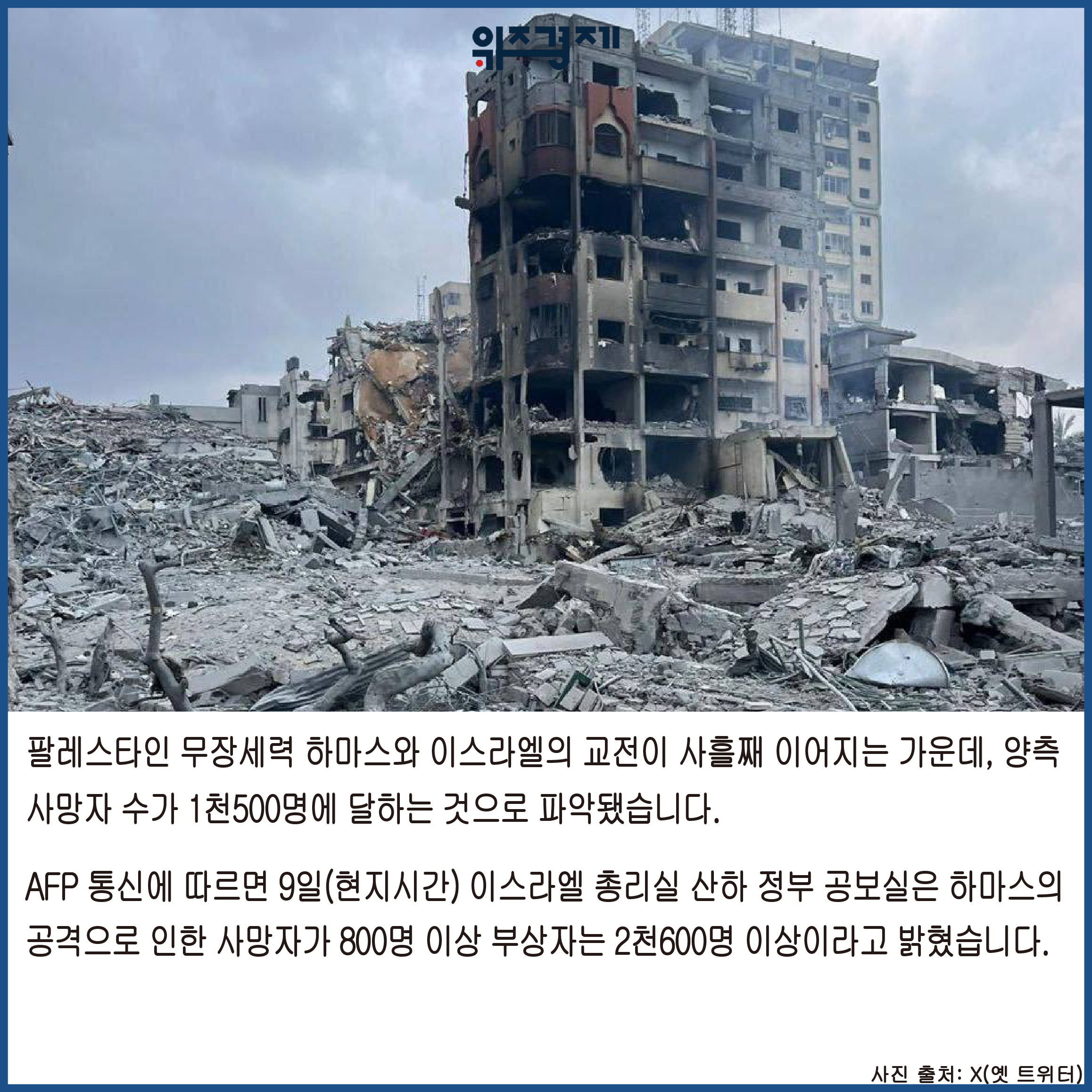 [위즈경제] 이정원 기자 =팔레스타인 무장세력 하마스와 이스라엘의 교전이 사흘째 이어지는 가운데, 양측 사망자 수가 1천500명에 달하는 것으로 파악됐습니다.