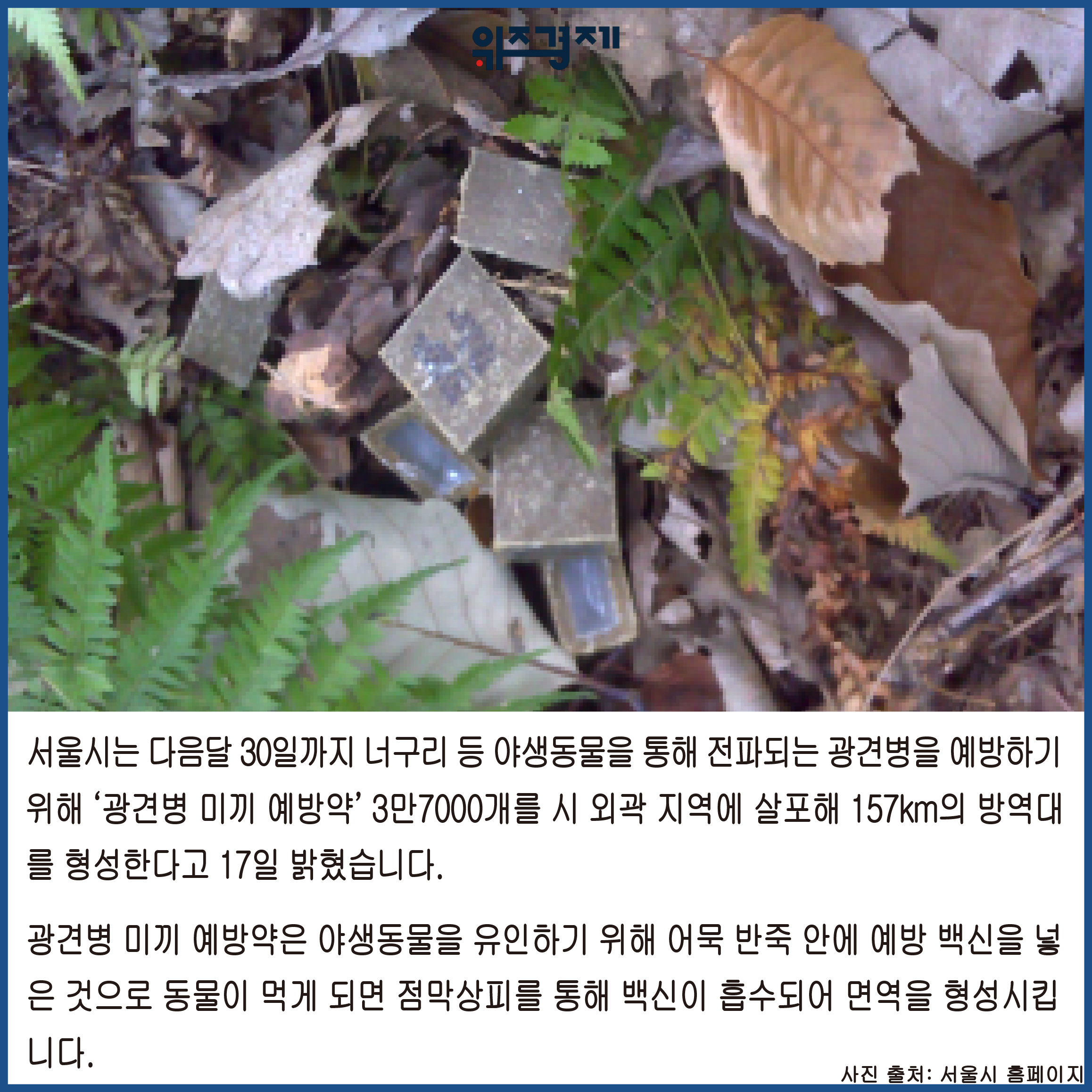 [위즈경제] 이정원 기자 =서울시는 다음달 30일까지 너구리 등 야생동물을 통해 전파되는 광견병을 예방하기 위해 ‘광견병 미끼 예방약’ 3만7000개를 시 외곽 지역에 살포해 157km의 방역대를 형성한다고 17일 밝혔습니다.