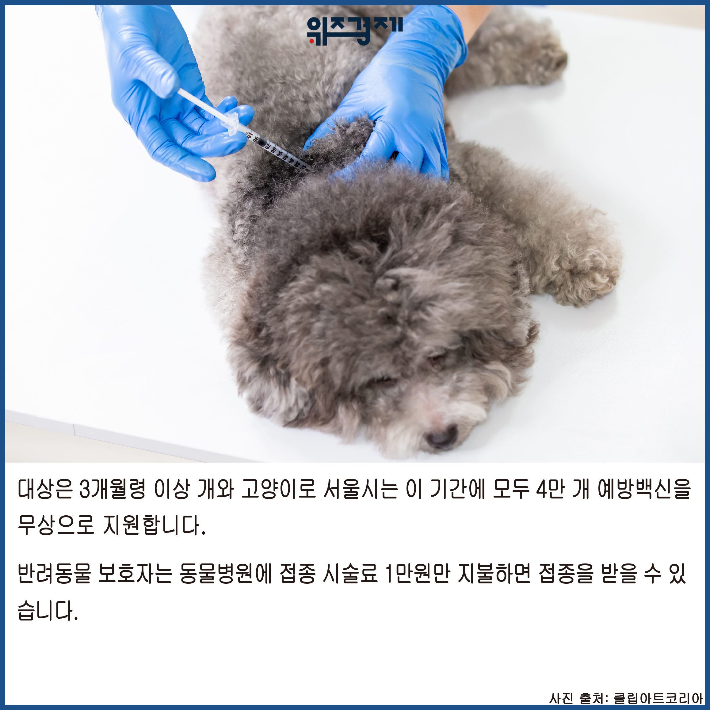 대상은 3개월령 이상 개와 고양이로 서울시는 이 기간에 모두 4만 개 예방백신을 무상으로 지원합니다.