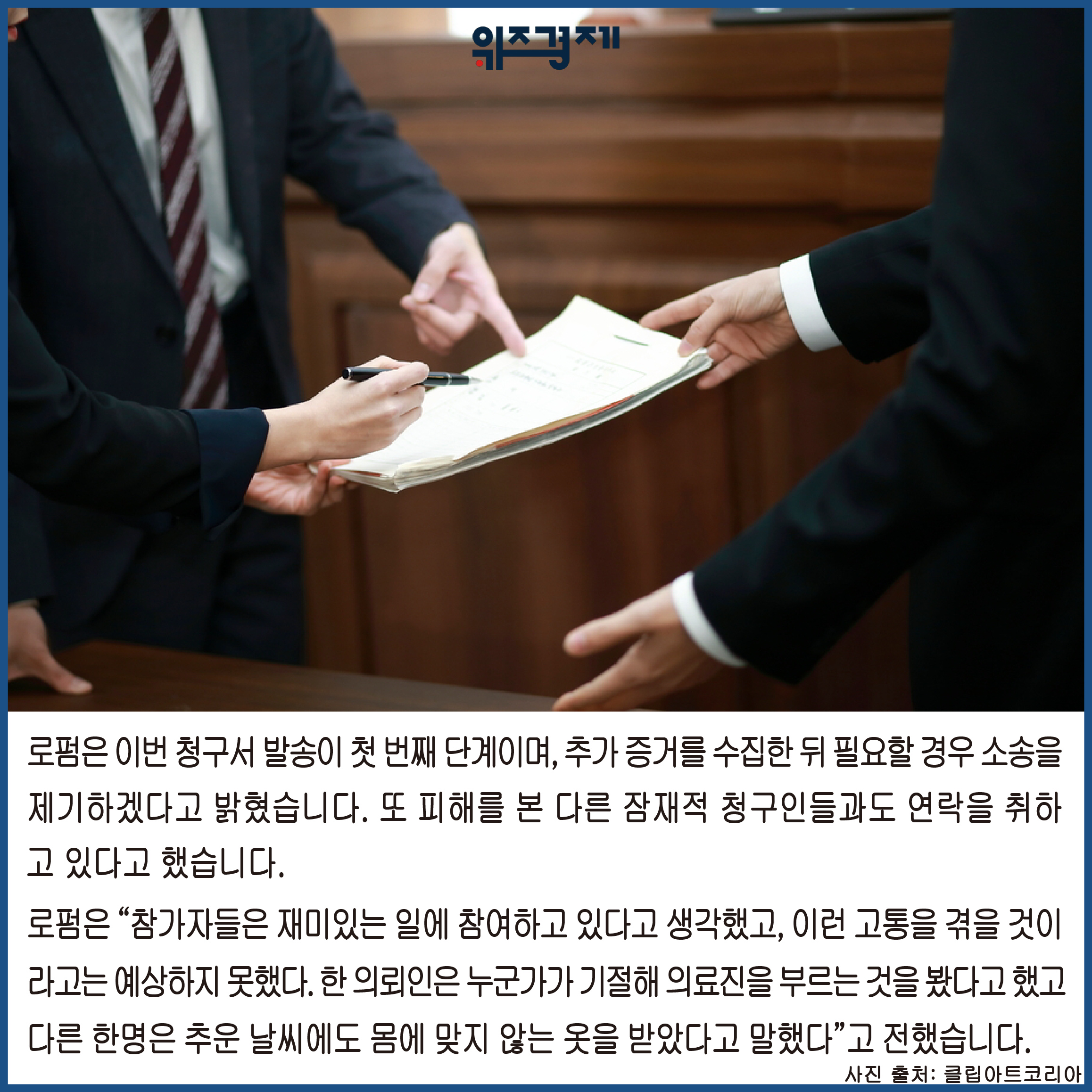 로펌은 “참가자들은 재미있는 일에 참여하고 있다고 생각했고, 이런 고통을 겪을 것이라고는 예상하지 못했다”며 “한 의뢰인은 누군가가 기절해 의료진을 부르는 것을 봤다고 했고, 다른