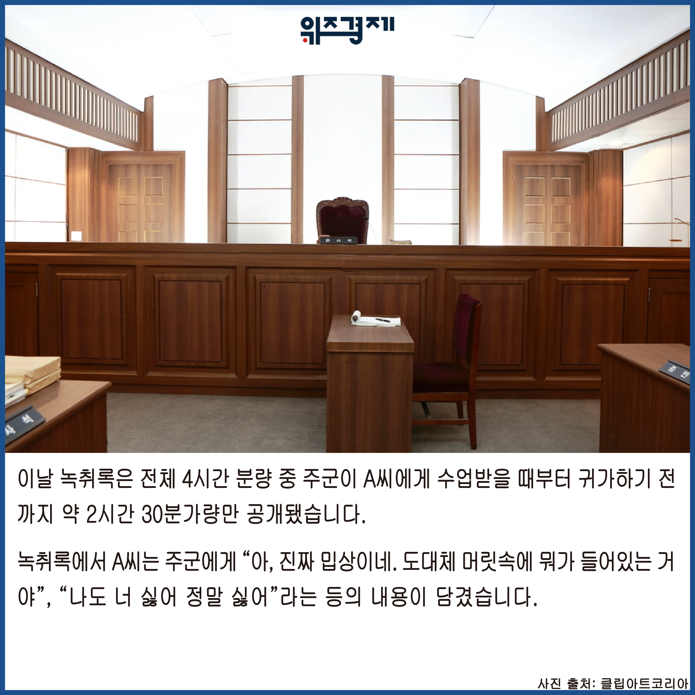 이날 녹취록은 전체 4시간 분량 중 주군이 A씨에게 수업받을 때부터 귀가하기 전까지 약 2시간 30분가량만 공개됐습니다.