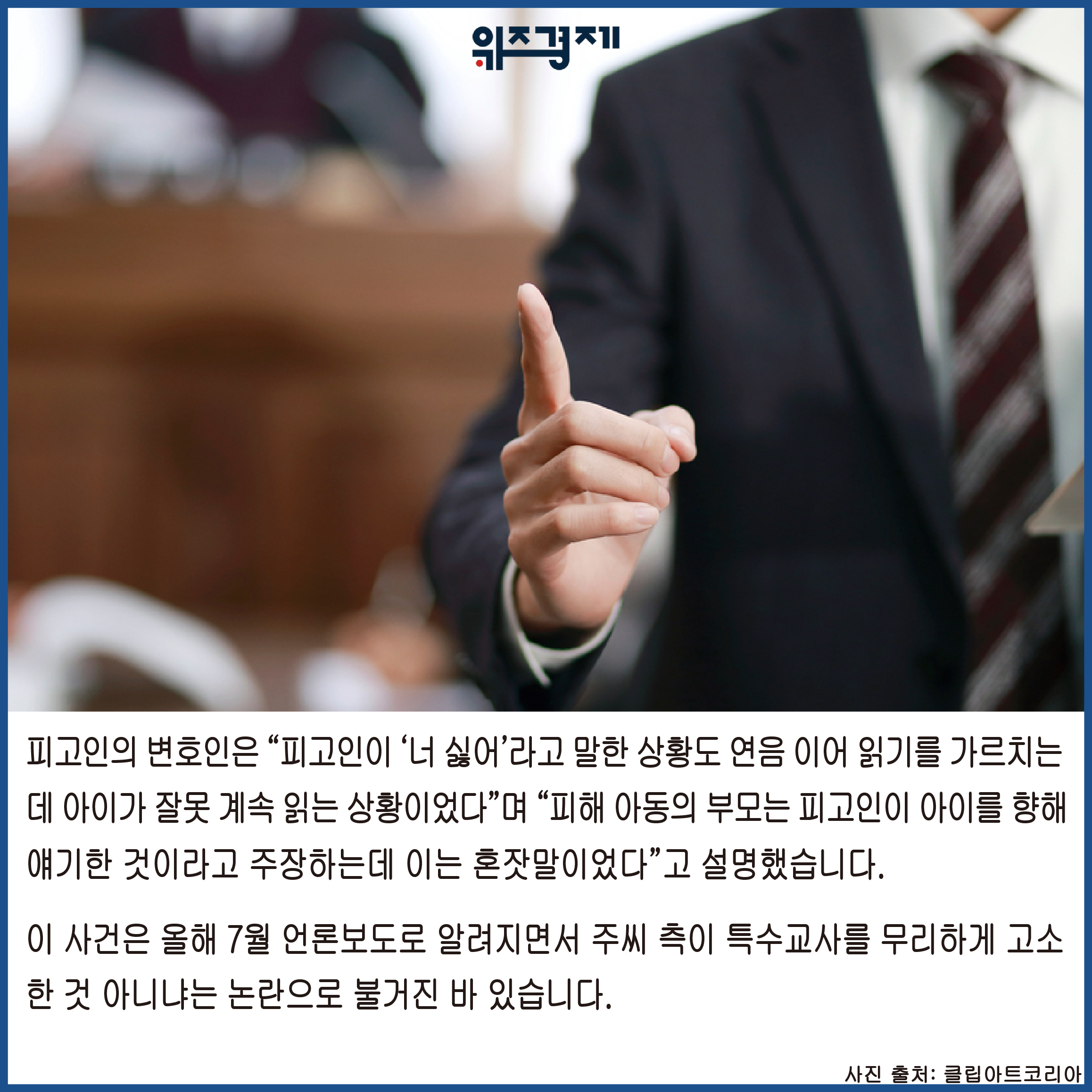 피고인의 변호인은 “피고인이 ‘너 싫어’라고 말한 상황도 연음 이어 읽기를 가르치는데 아이가 잘못