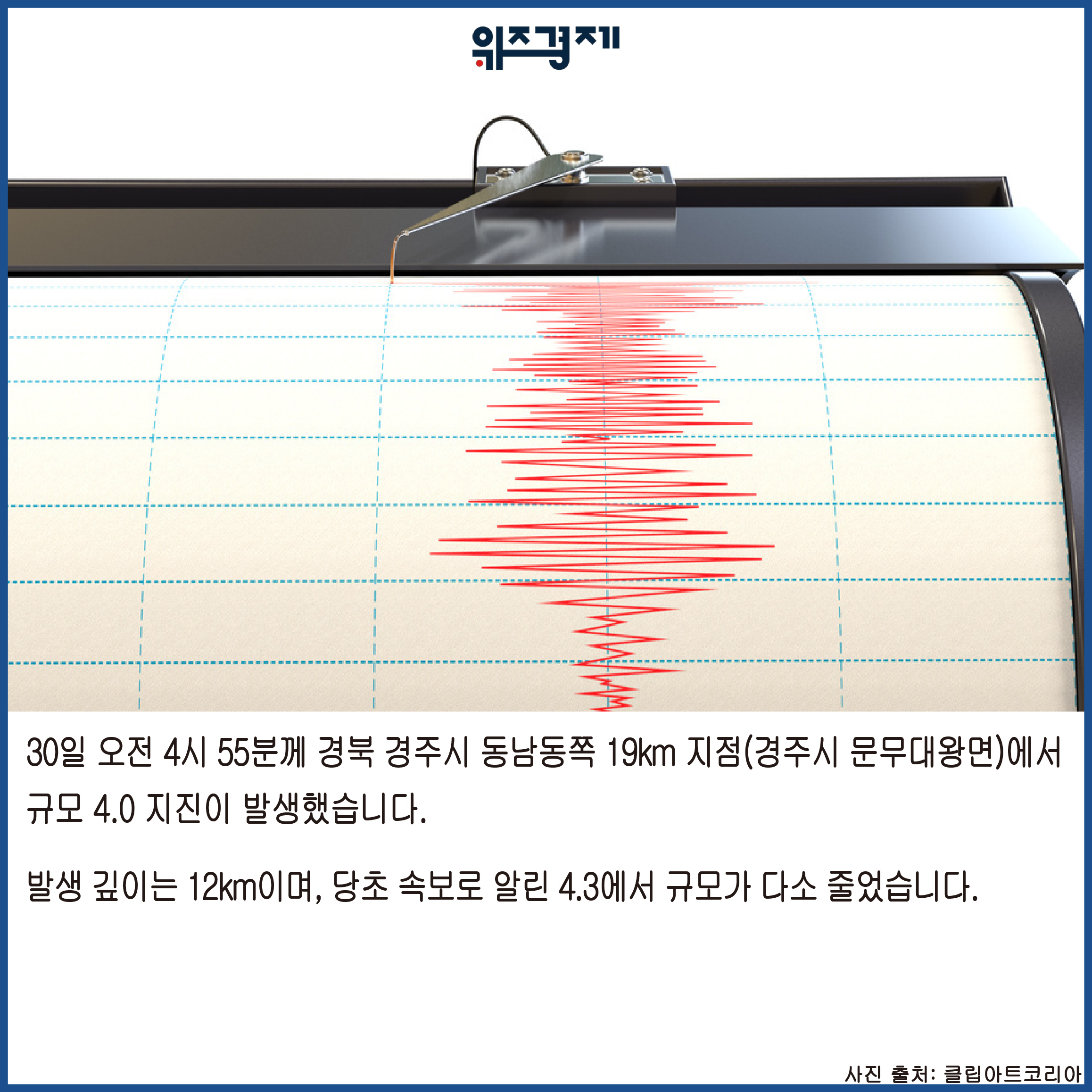 [위즈경제] 이정원 기자 =30일 오전 4시 55분께 경북 경주시 동남동쪽 19km 지점(경주시 문무대왕면)에서 규모 4.0 지진이 발생했습니다.