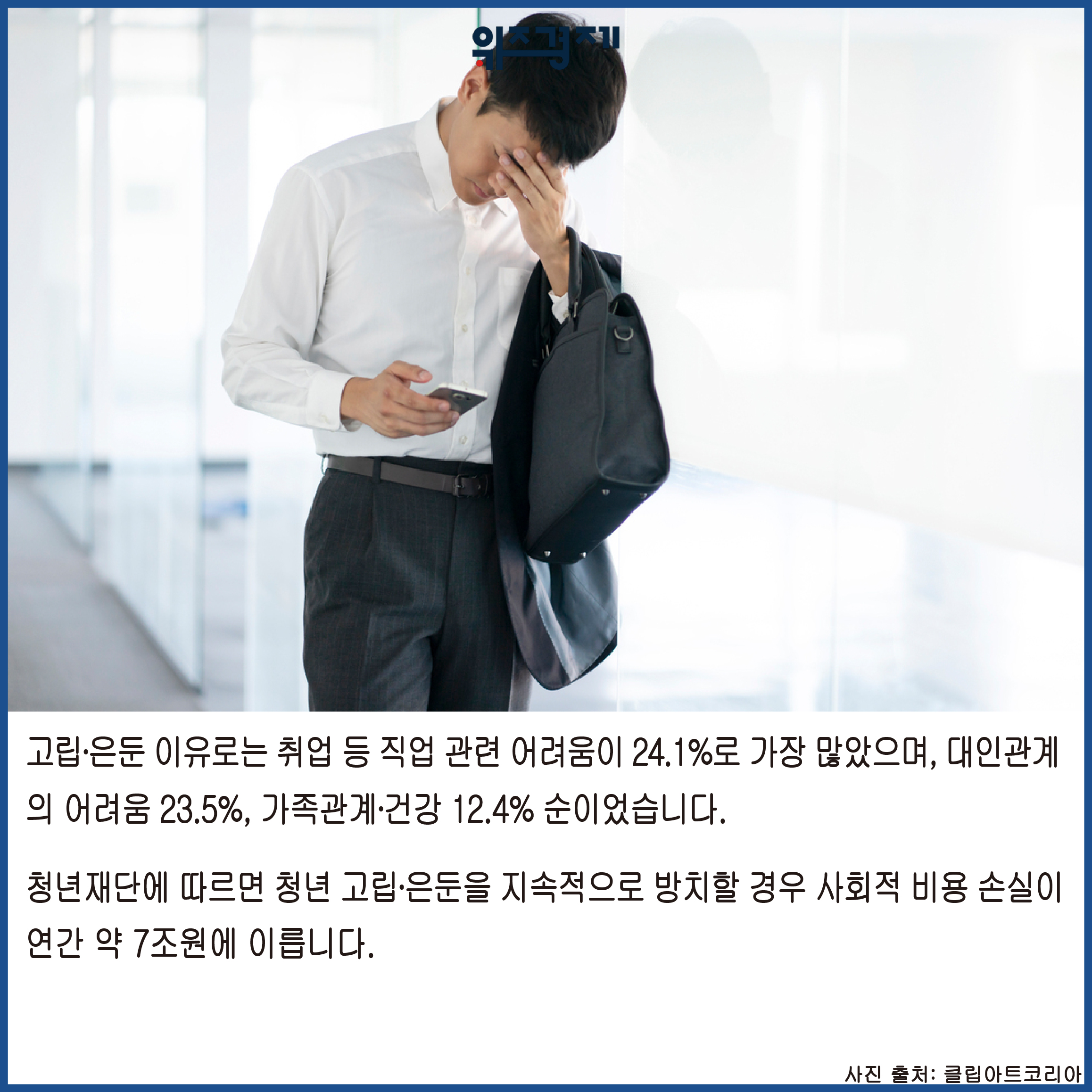 이유로는 취업 등 직업 관련 어려움이 24.1%로 가장 많았으며, 대인관계의