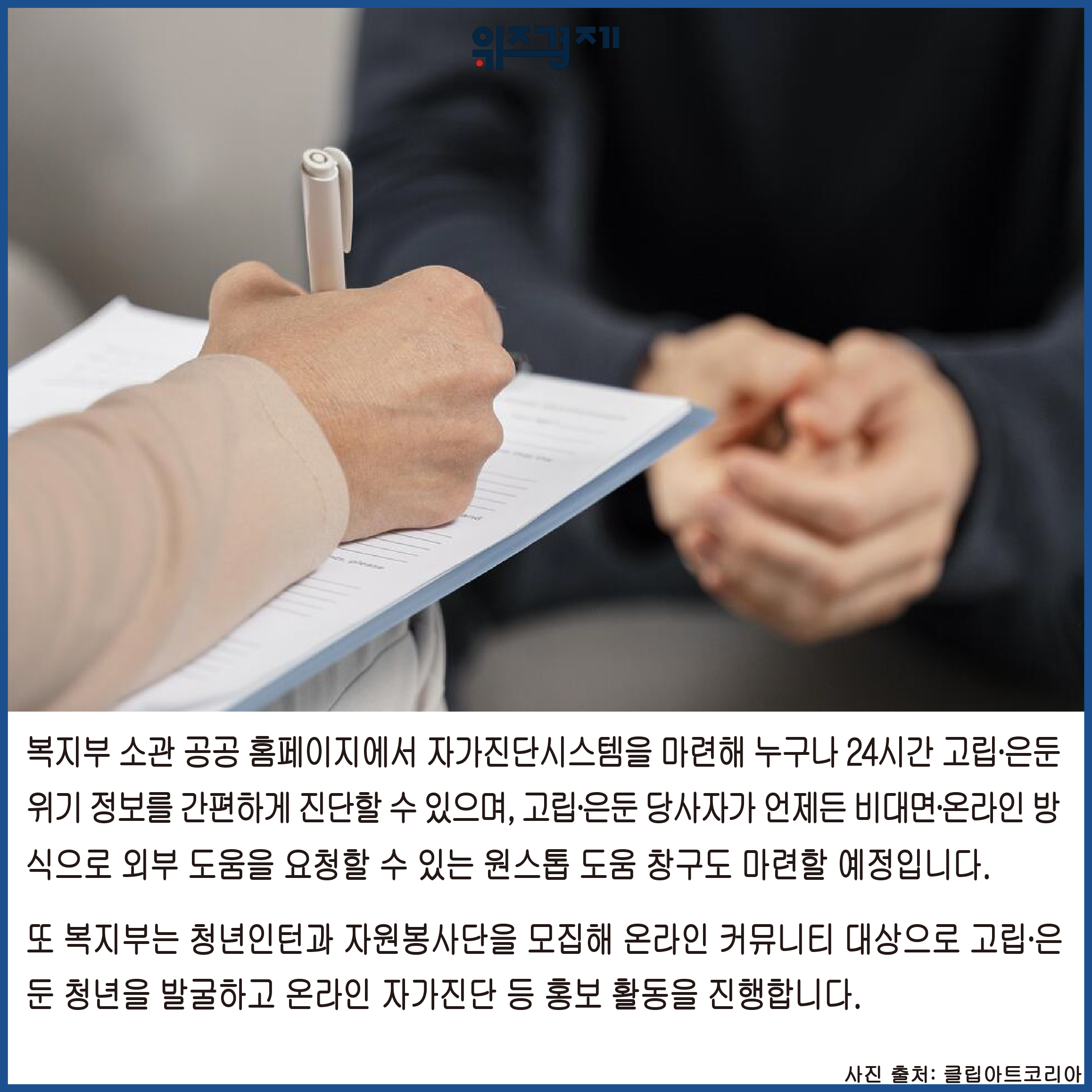 복지부는 청년인턴과 자원봉사단을 모집해 온라인 커뮤니티 대상으로 고립∙은둔 청년을 발굴하고 온라인 자가진단 등 홍보 활동을 진행합니다.